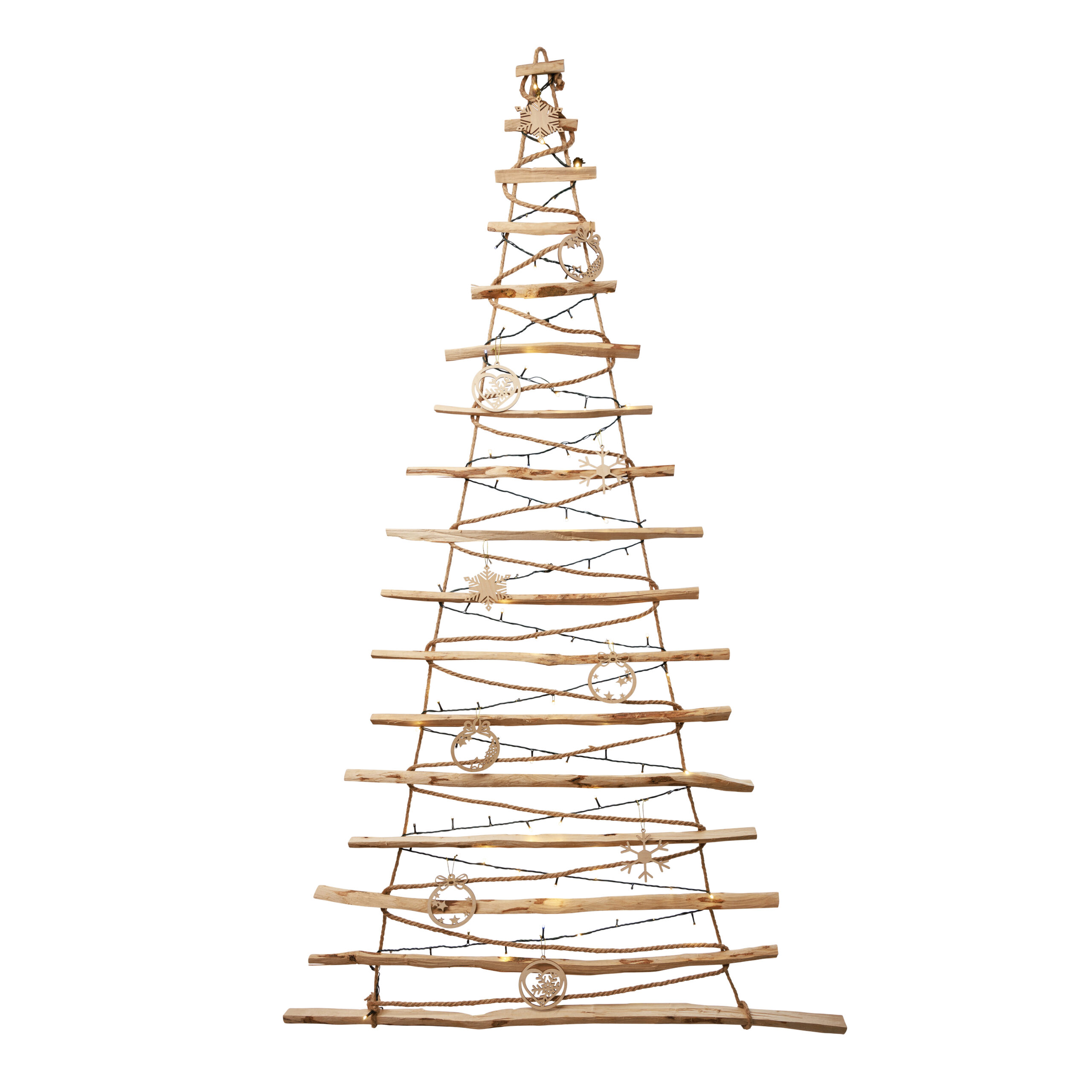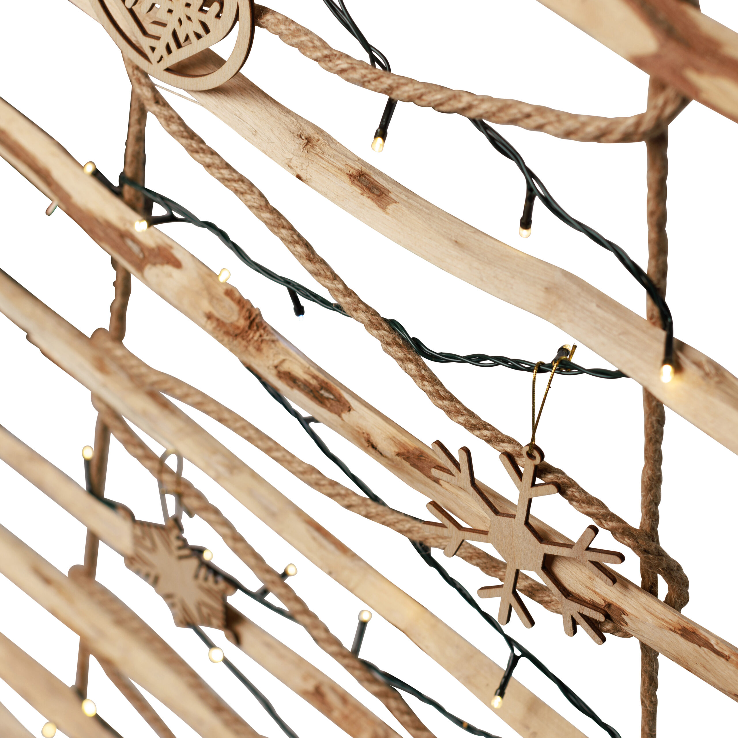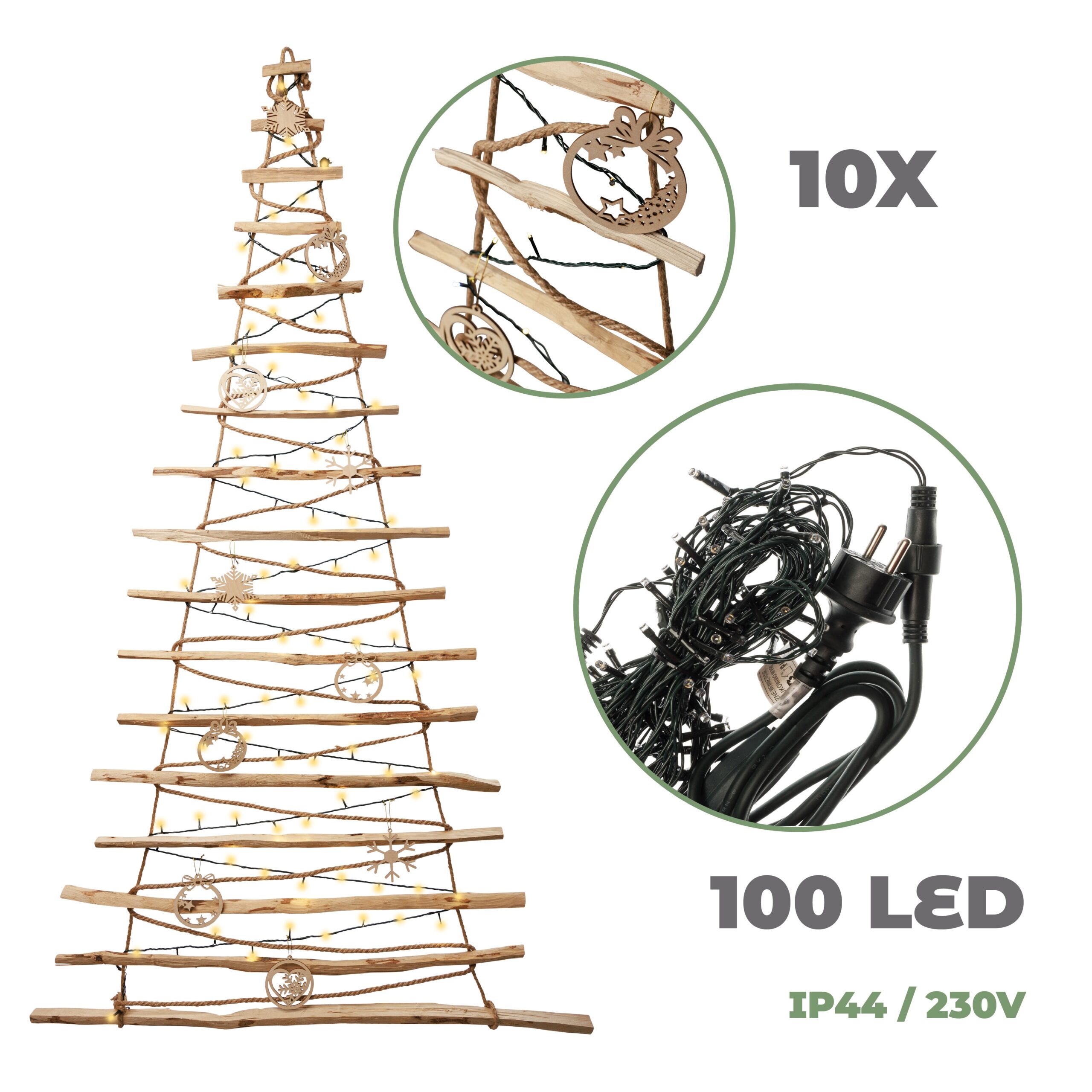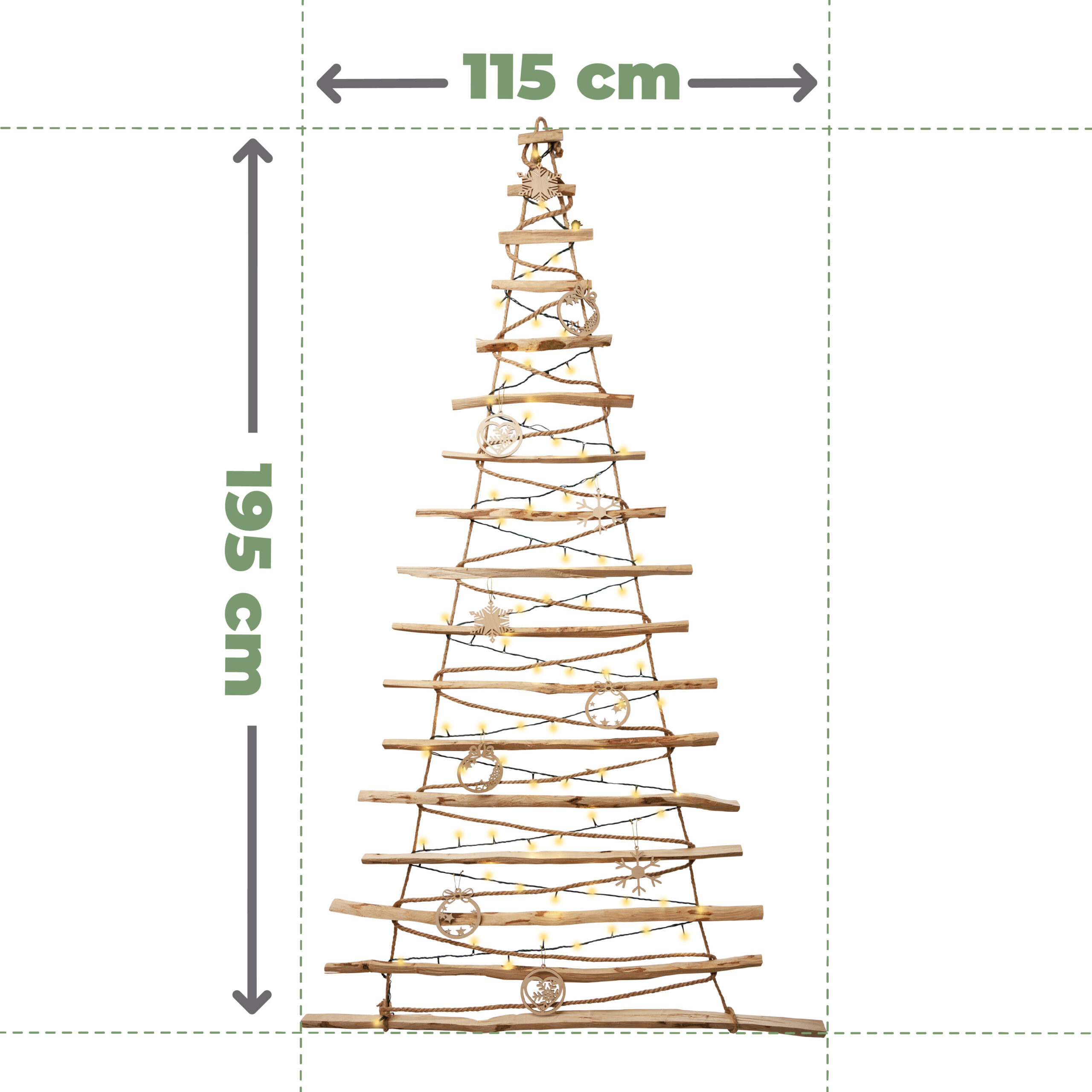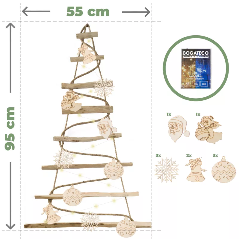 Piękna, naturalna choinka o wysokości 195 cm, wykonana z leszczyny, połączona ekologicznym sznurem jutowym o grubości 6 mm. W zestawie energooszczędne zewnętrzne lampki LED, na grubych, wodoodpornych kablach,  10 szt. dużych świątecznych zawieszek, dekoracyjny sznur jutowy o grubości 8 mm.