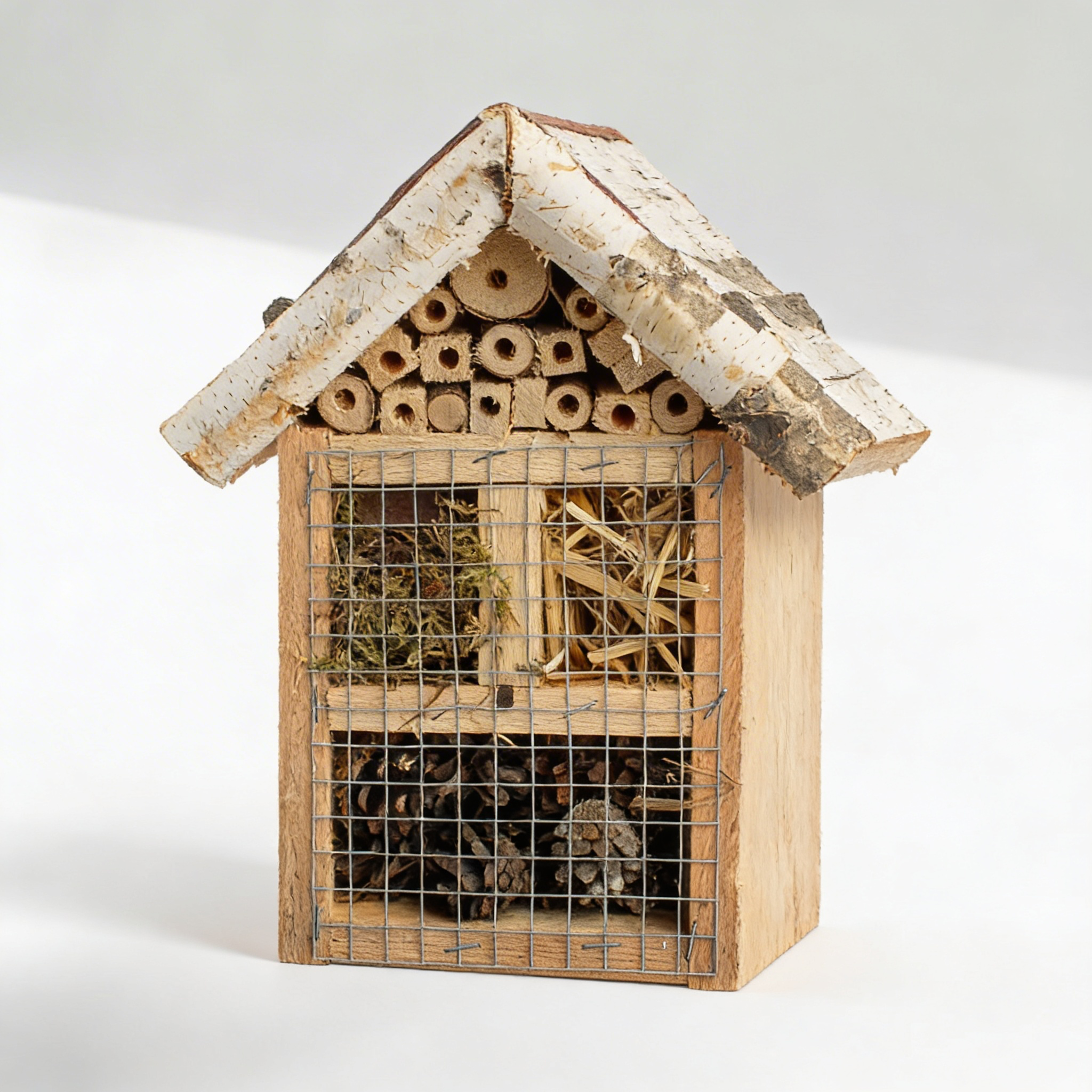 - Ocynkowana siatka o drobnych oczkach zapobiegająca wypadaniu materiału wypełniającego hotel oraz chroni gniazda przed ptakami owadożernymi i gryzoniami.