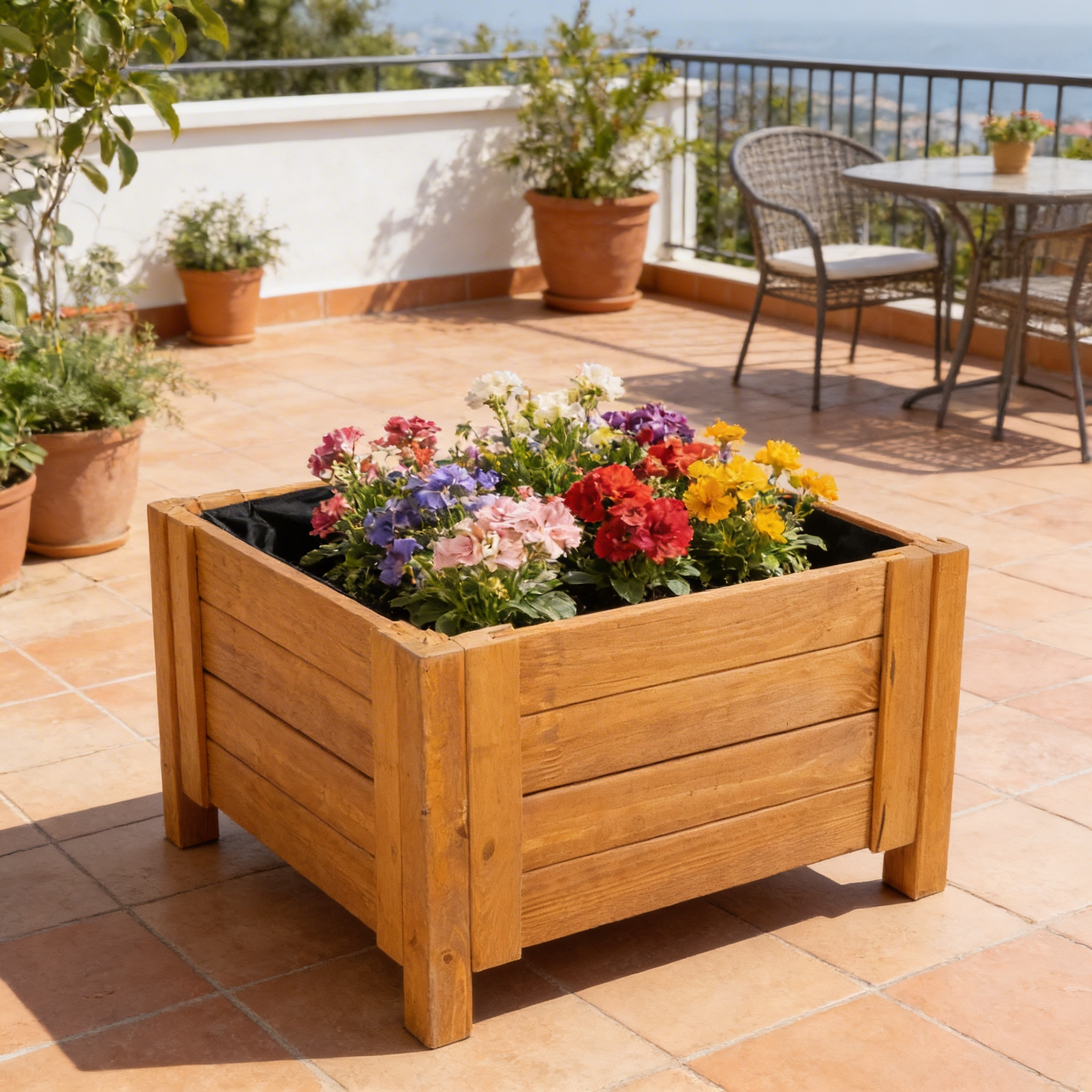 FUNKCJONALNOŚĆ - Donica drewniana umożliwia całoroczną uprawę roślin lub kwiatów. Uniwersalny kształt umożliwia umieszczenie jej w dowolnej częśći ogrodu lub tarasu.