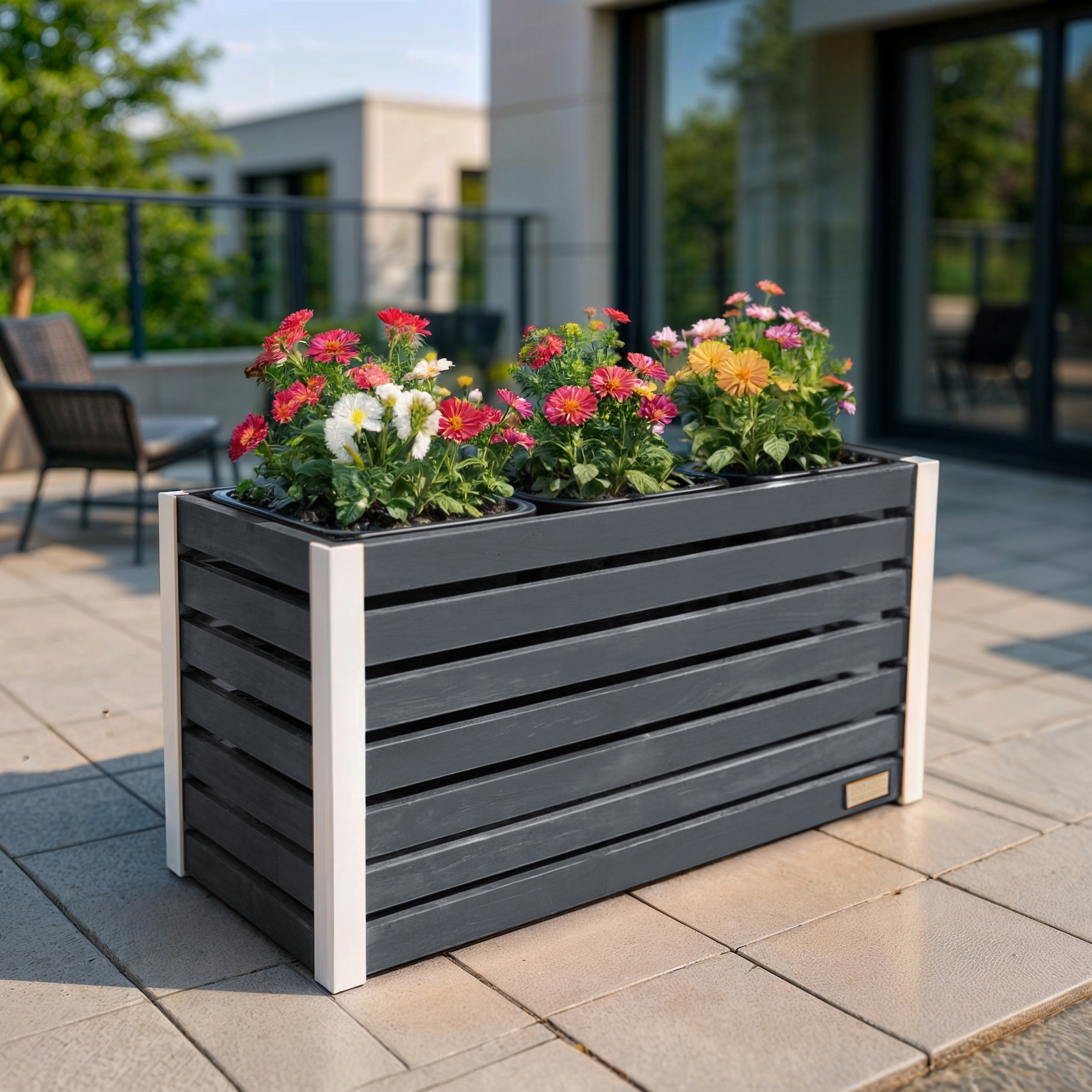 FUNKCJONALNOŚĆ - Donica drewniana umożliwia całoroczną uprawę roślin lub kwiatów. Uniwersalny kształt umożliwia umieszczenie jej w dowolnej częśći ogrodu lub tarasu.