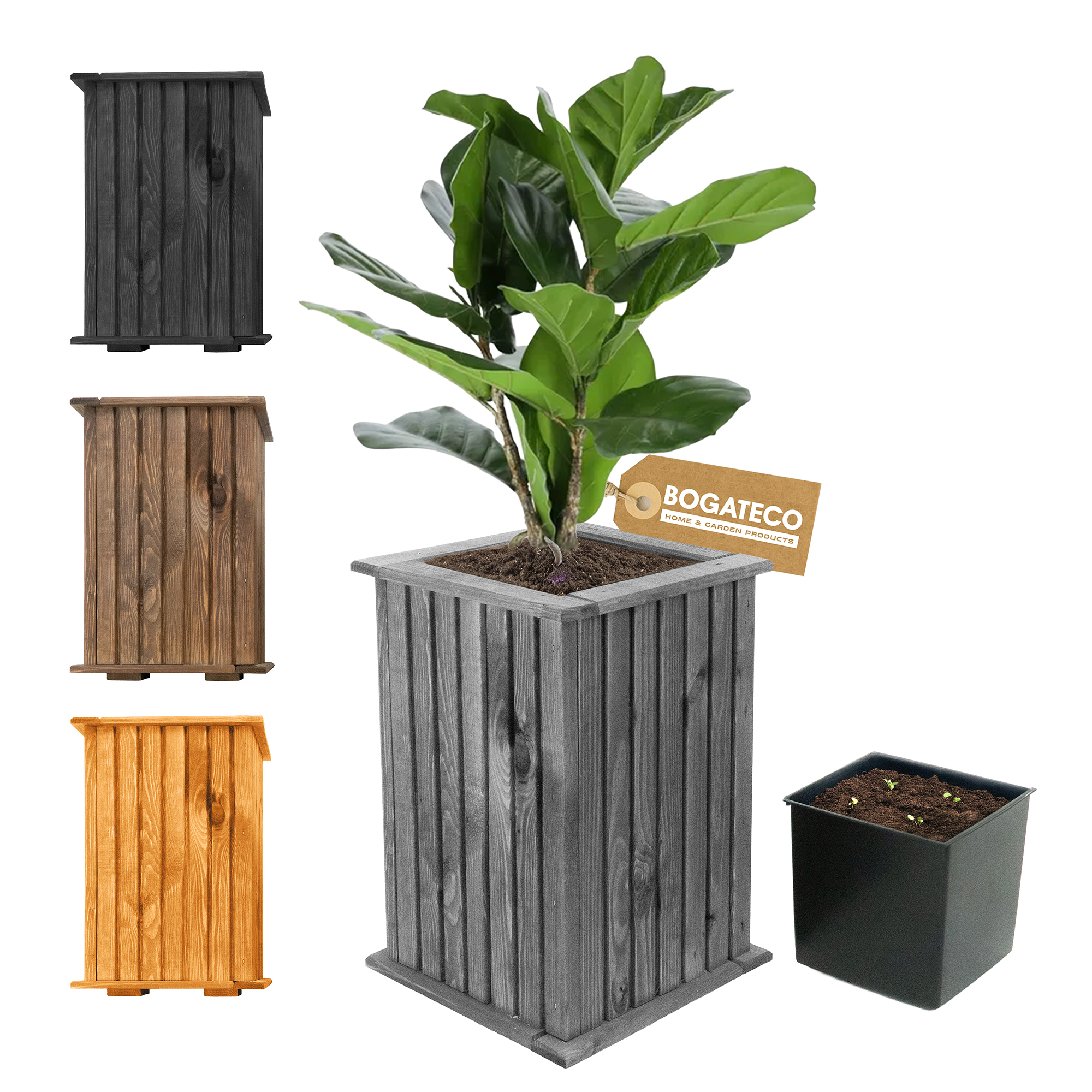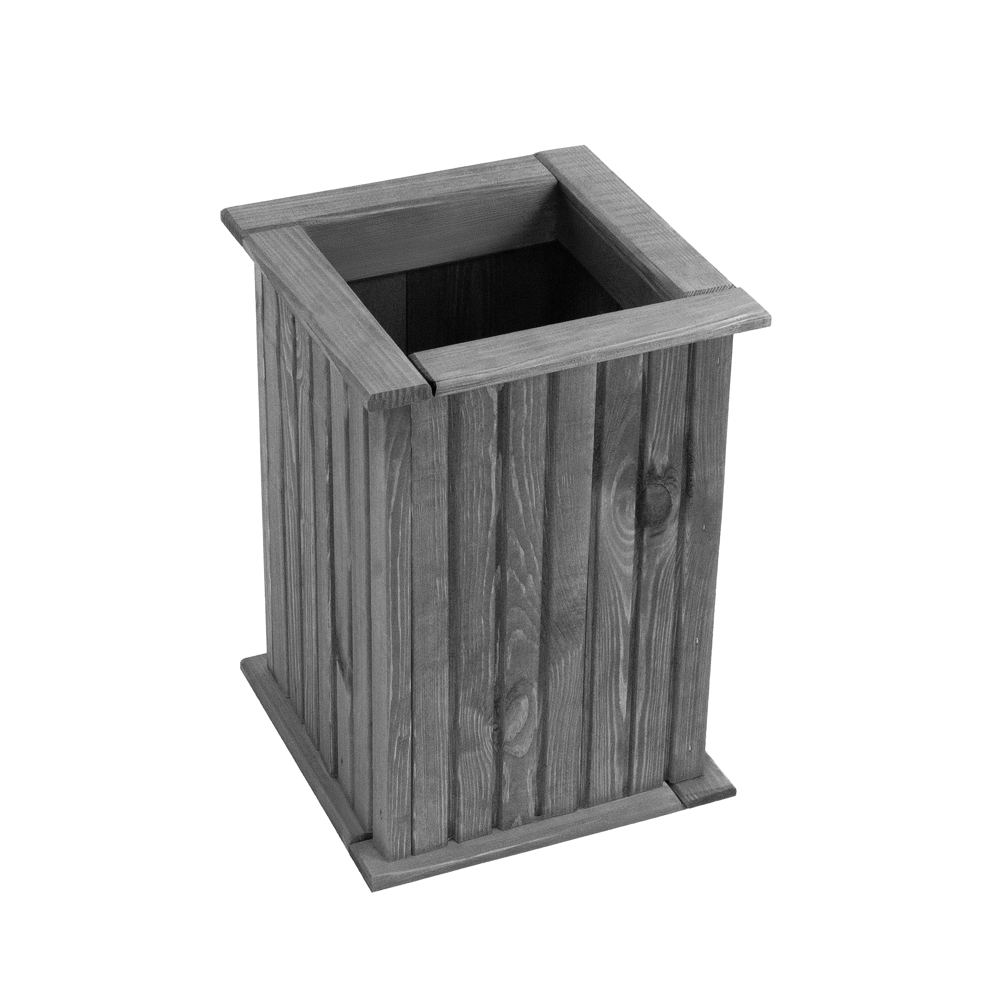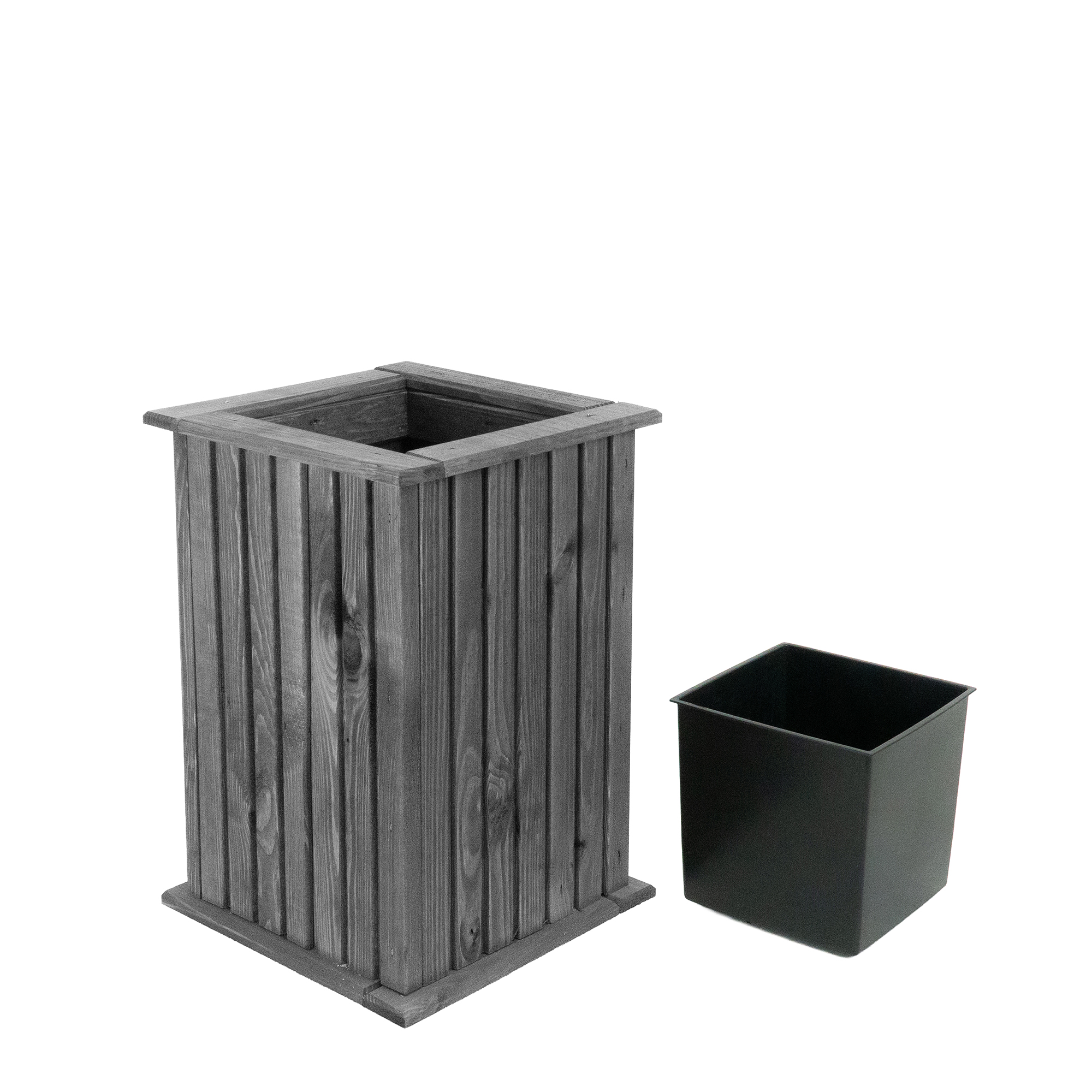 Doniczka wykonana z drewna sosnowego. Doskonała jakość i trwałość. W zestawie plastikowy wkład. Idealnie pasuje do pomieszczeń oraz tarasów zewnętrznych.