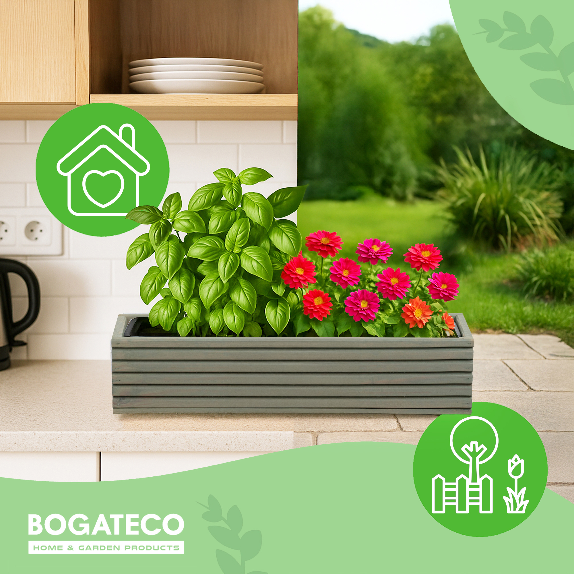 Drewniana konstrukcja wyróżnia się solidnością, a jednocześnie pozostaje lekka i łatwa do przenoszenia. Dzięki wadze wynoszącej 2,7 kg produkt można bez problemu ustawić w dowolnym miejscu, bez ryzyka uszkodzenia nawierzchni czy nadmiernego obciążenia balkonu. To sprawia, że doniczka jest wyborem uniwersalnym, który pasuje do różnych typów przestrzeni. Osoby ceniące porządek i estetykę mogą dzięki niej zbudować harmonijną kompozycję roślinną, która będzie ozdobą przez cały sezon.