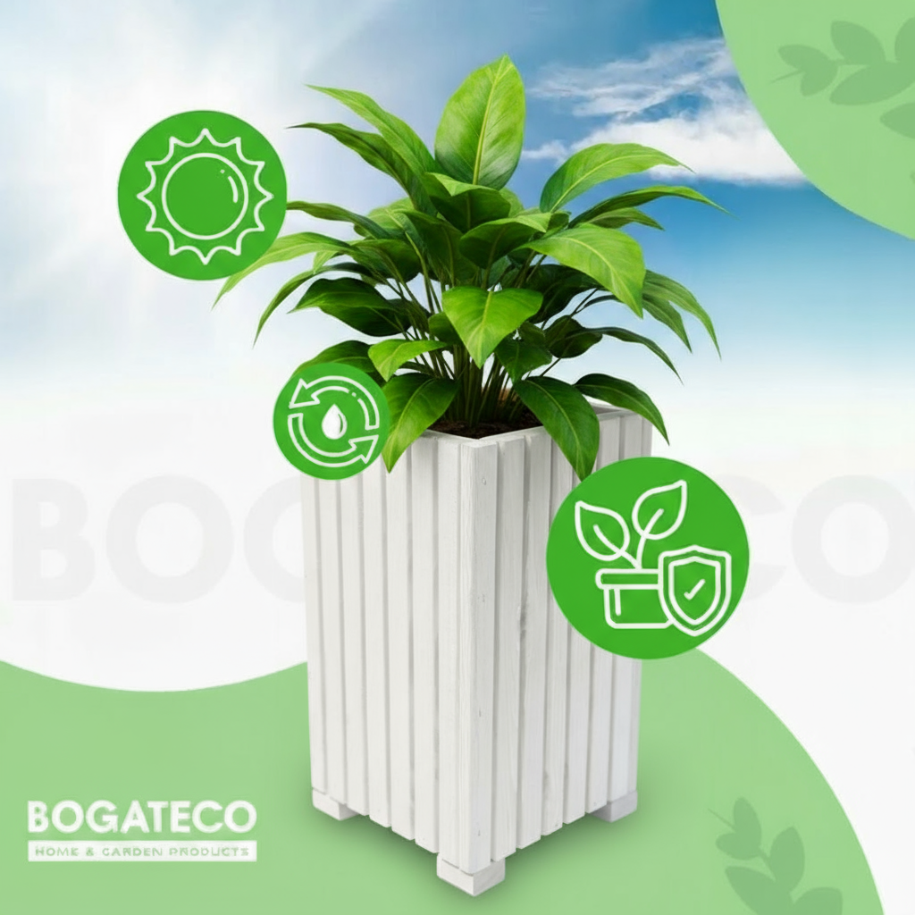 Donica ogrodowa BOGATECO to doskonały wybór dla każdego, kto ceni naturalne materiały i przemyślany design. Wykonanie z wysokiej jakości drewna sosnowego , zapewnia trwałość na lata i opcjonalne zmienne warunki atmosferyczne.