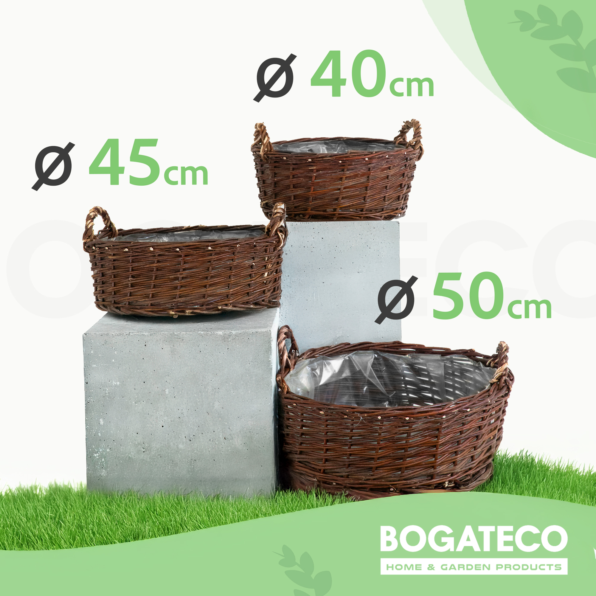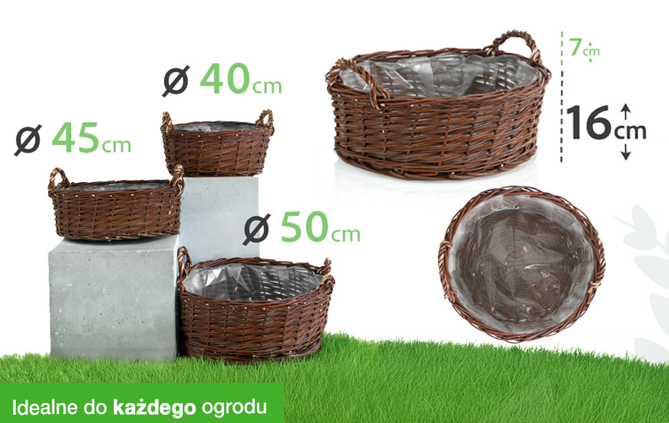 Dostępne w trzech rozmiarach – 40 cm, 45 cm i 50 cm – doniczki wiklinowe pozwalają tworzyć różnorodne kompozycje dostosowane do Twoich potrzeb i przestrzeni. Od minimalistycznych zestawień po wielopoziomowe dekoracje ogrodowe – możliwości są niemal nieograniczone.