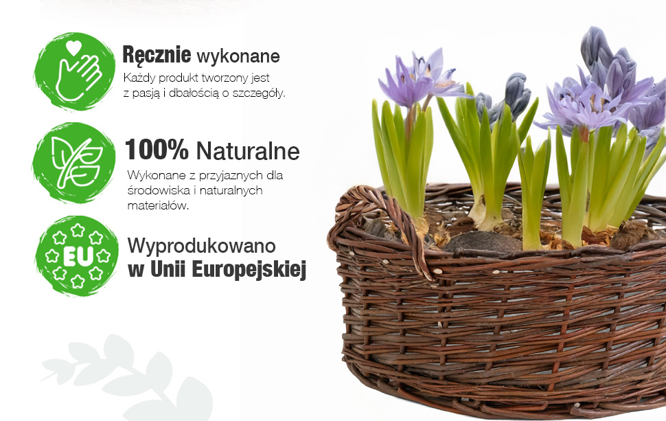 Stworzone wyjątkowe, kwietne aranżacje dzięki wiklinowej doniczce z uchwytami , która łączy w sobie naturalny urok i funkcjonalności . Ręcznie pleciona z wikliny, wyścielona folią dla skutecznej ochrony, idealnie sprawdziła się do sadzenia cebul, kwiatów balkonowych, doniczkowych oraz jesiennych wrzosów .