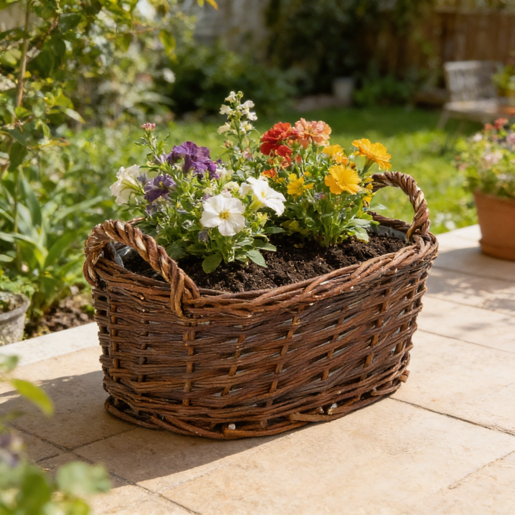 Stworzone wyjątkowe, kwietne aranżacje dzięki wiklinowej doniczce z uchwytami , która łączy w sobie naturalny urok i funkcjonalności . Ręcznie pleciona z wikliny, wyścielona folią dla skutecznej ochrony, idealnie sprawdziła się do sadzenia cebul, kwiatów balkonowych, doniczkowych oraz jesiennych wrzosów .