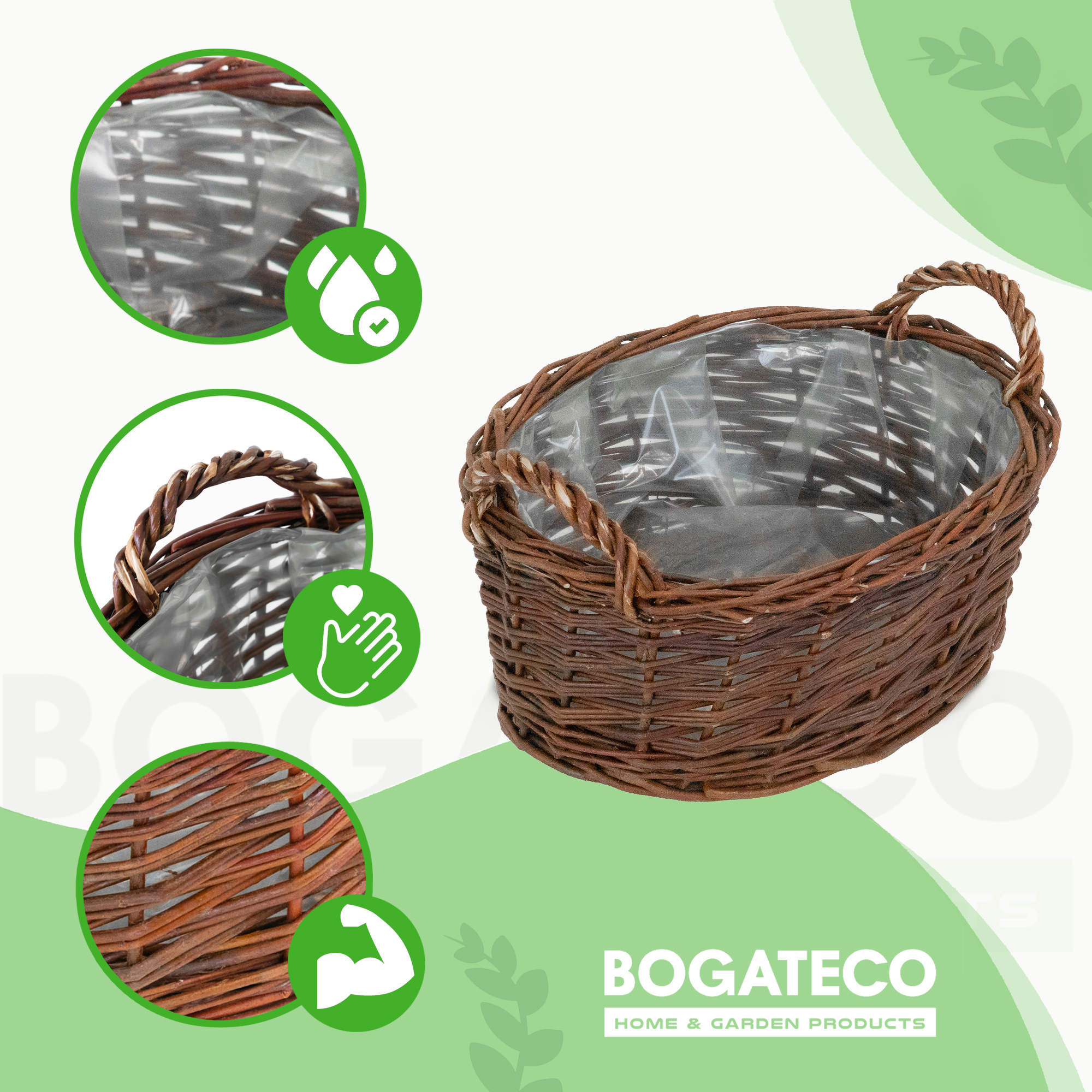 Wnętrze każdej doniczki wyłożone jest folią ochronną, która zabezpiecza wiklinę przed wilgocią podczas podlewania. Dzięki temu można sadzić bezpośrednio np. cebule, zioła, wrzos, kwiaty doniczkowe i balkonowe, bez obawy o przeciekanie i zabrudzenie powierzchni, na której stoi doniczka.