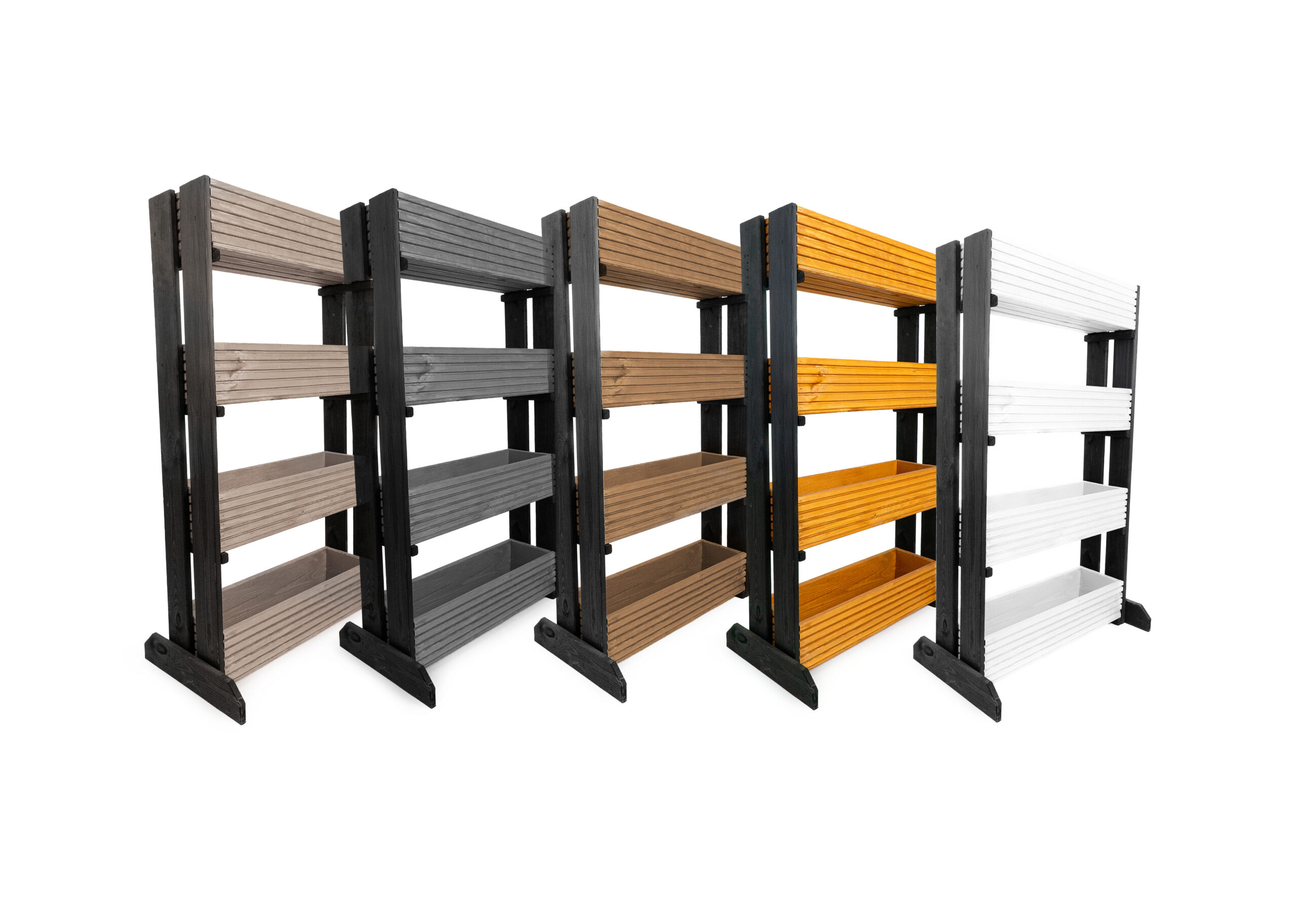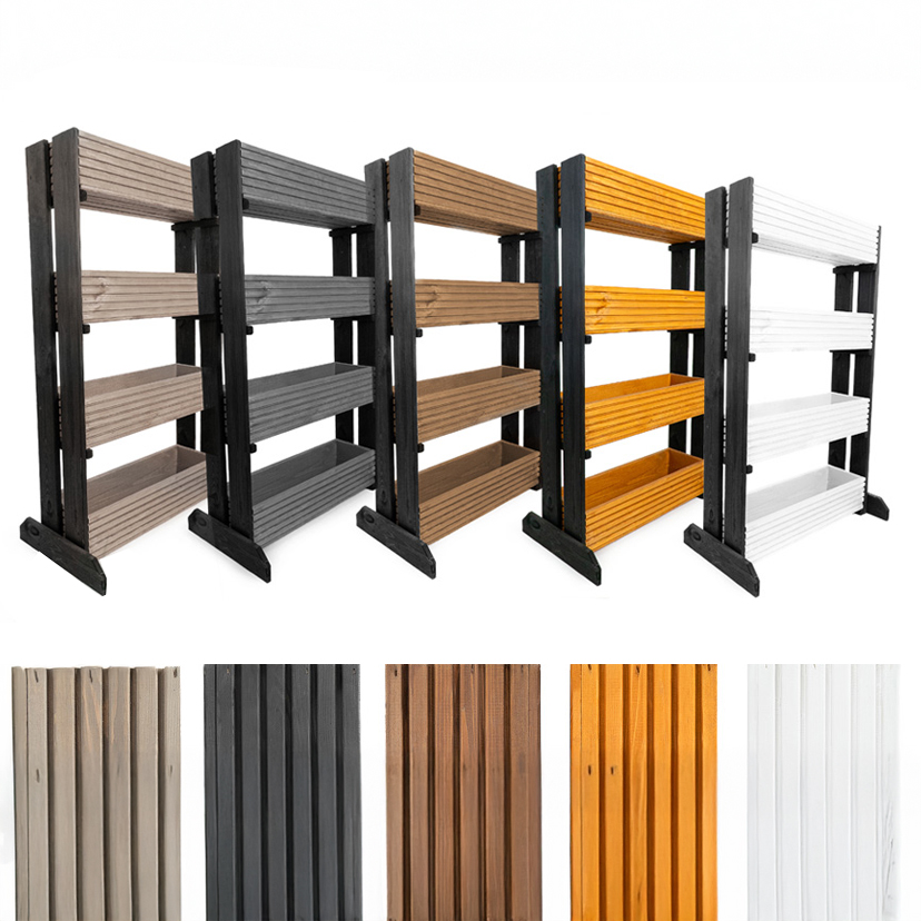 Nasze kwietniki z 4 donicami dostępne są w pięciu starannie dobranych wersjach kolorystycznych: naturalny beż, grafit, ciepły brąz, miodowy odcień drewna oraz klasyczna biel. Każdy znajdzie wariant pasujący do swojego stylu.