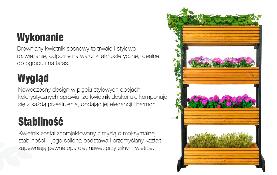 Jako polski producent kwietników, zapewniamy nie tylko stylowy wygląd, ale także solidną konstrukcję wykonaną z wysokiej jakości drewna sosnowego. Stawiamy na trwałość i estetykę.