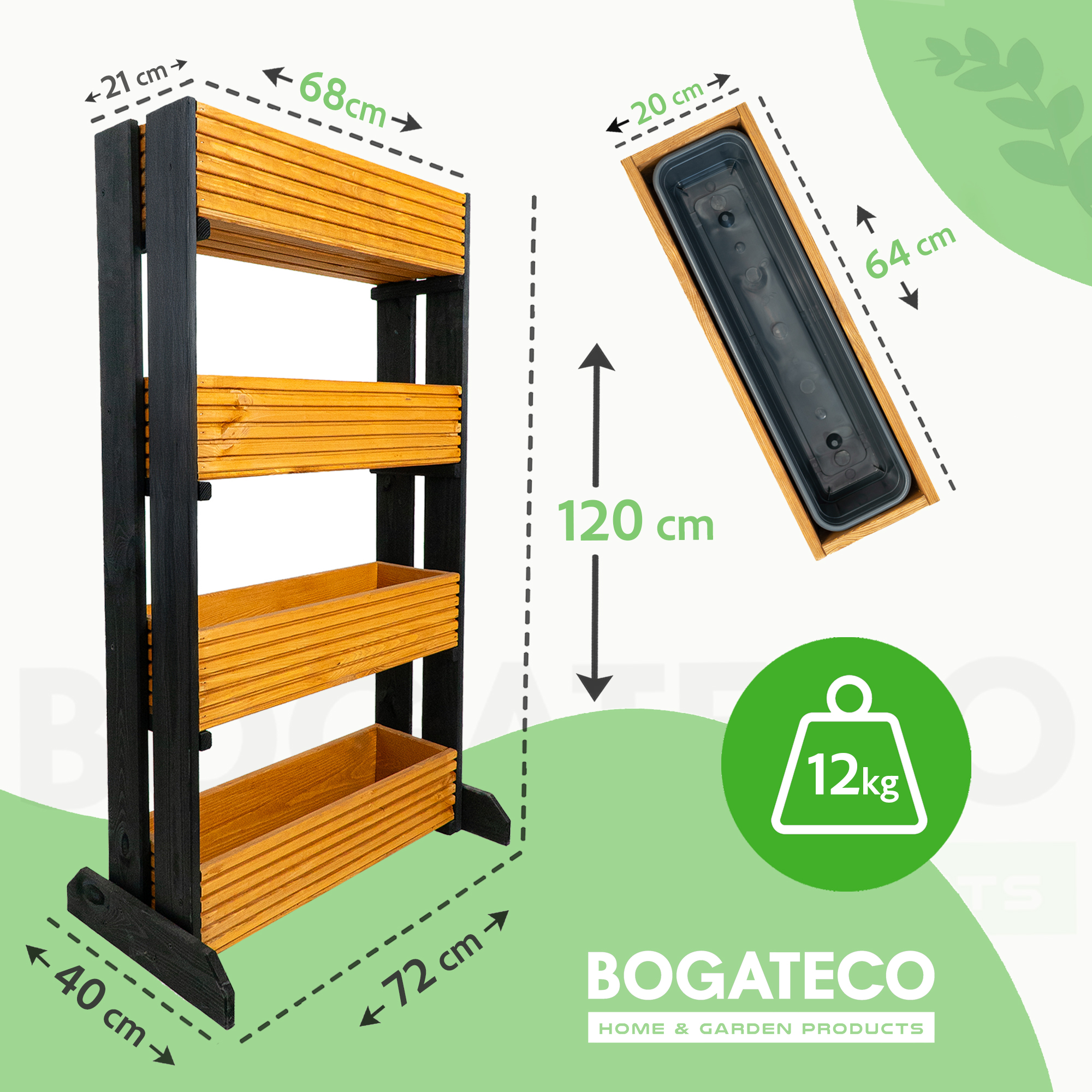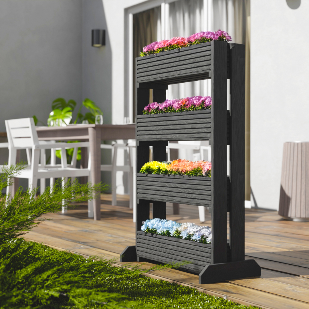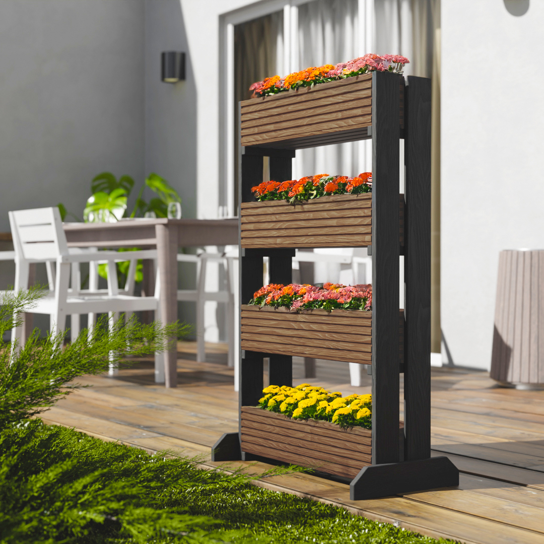 Kwietniki dostępne są w dwóch wariantach: na 3 lub 4 poziomy, co pozwala dopasować je do przestrzeni – mniejszy balkon, większy taras lub przydomowy ogród. Wersja z 4 donicami to maksymalna efektywność w pionowej uprawie.