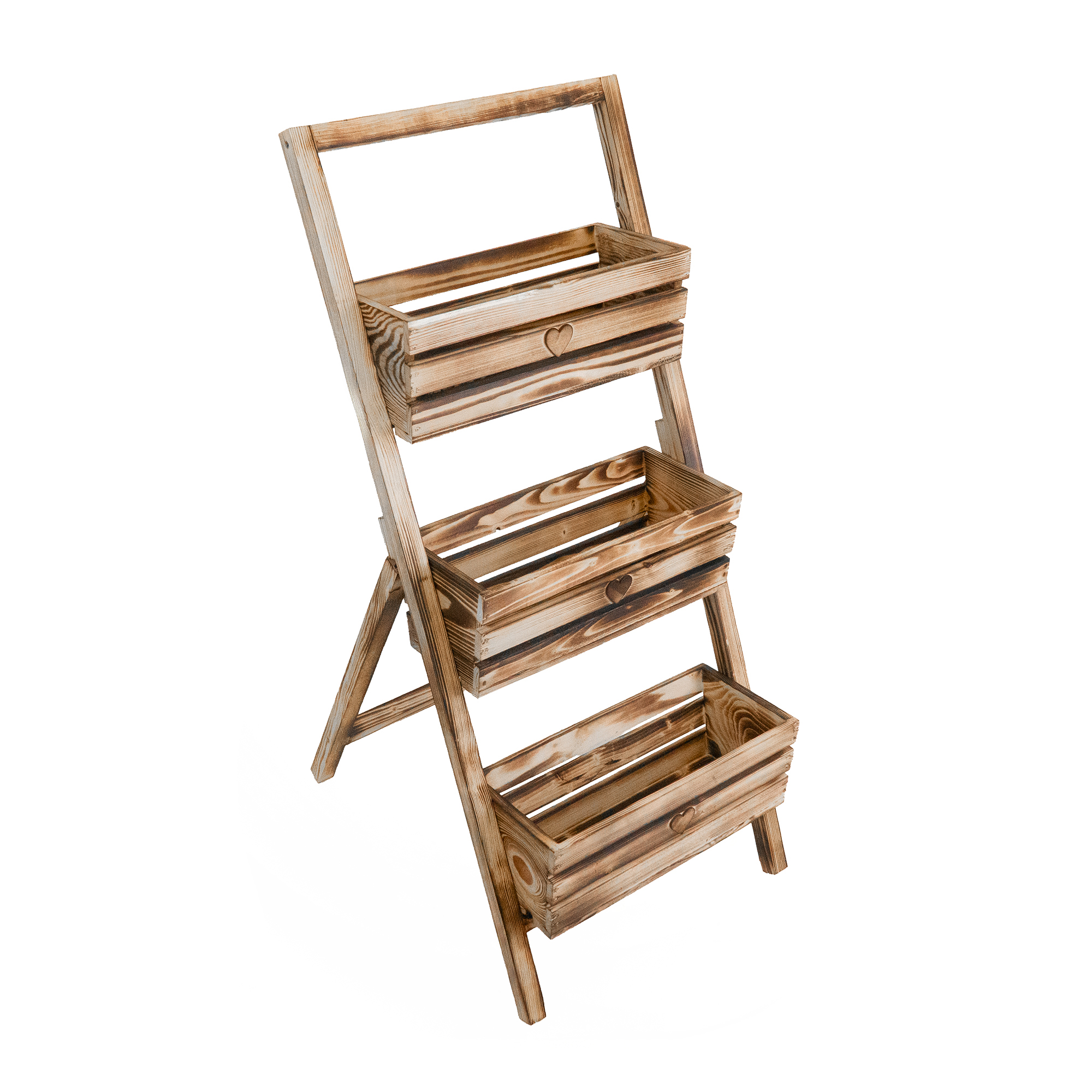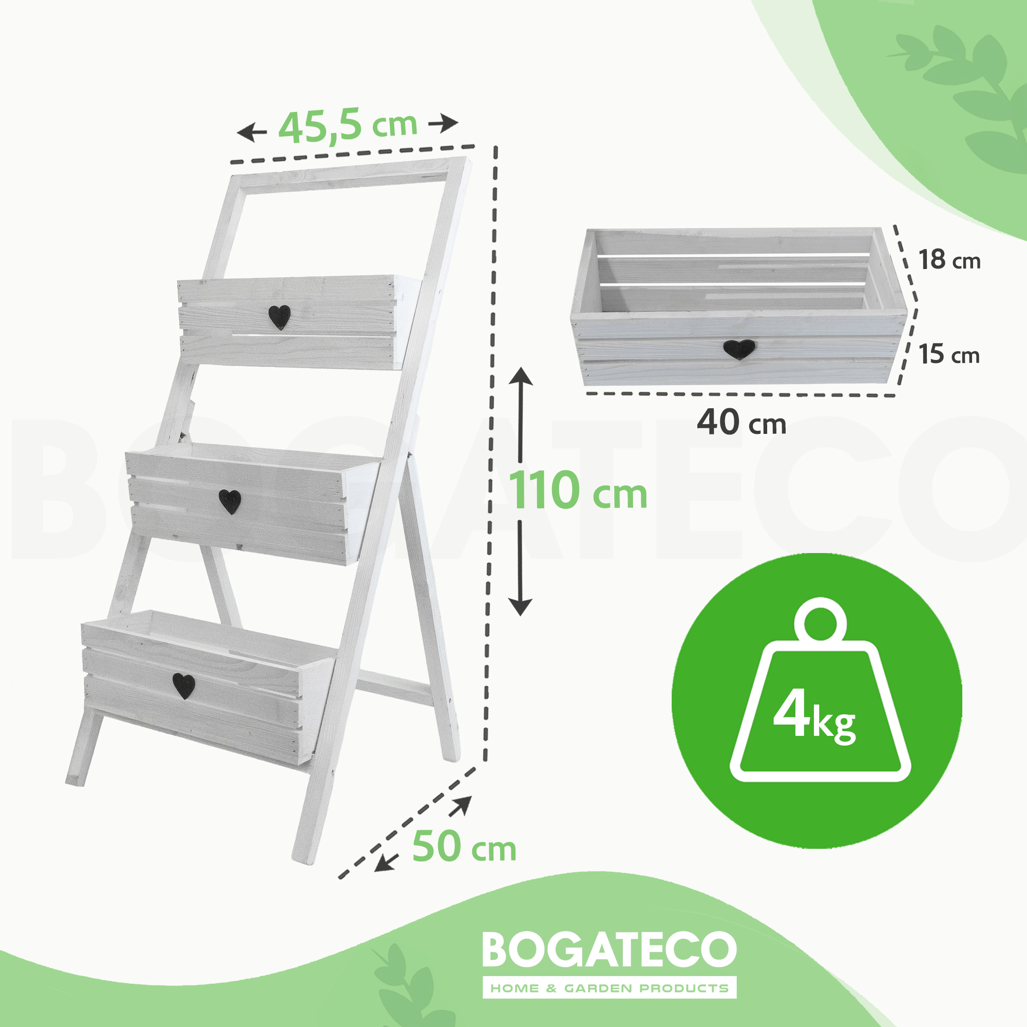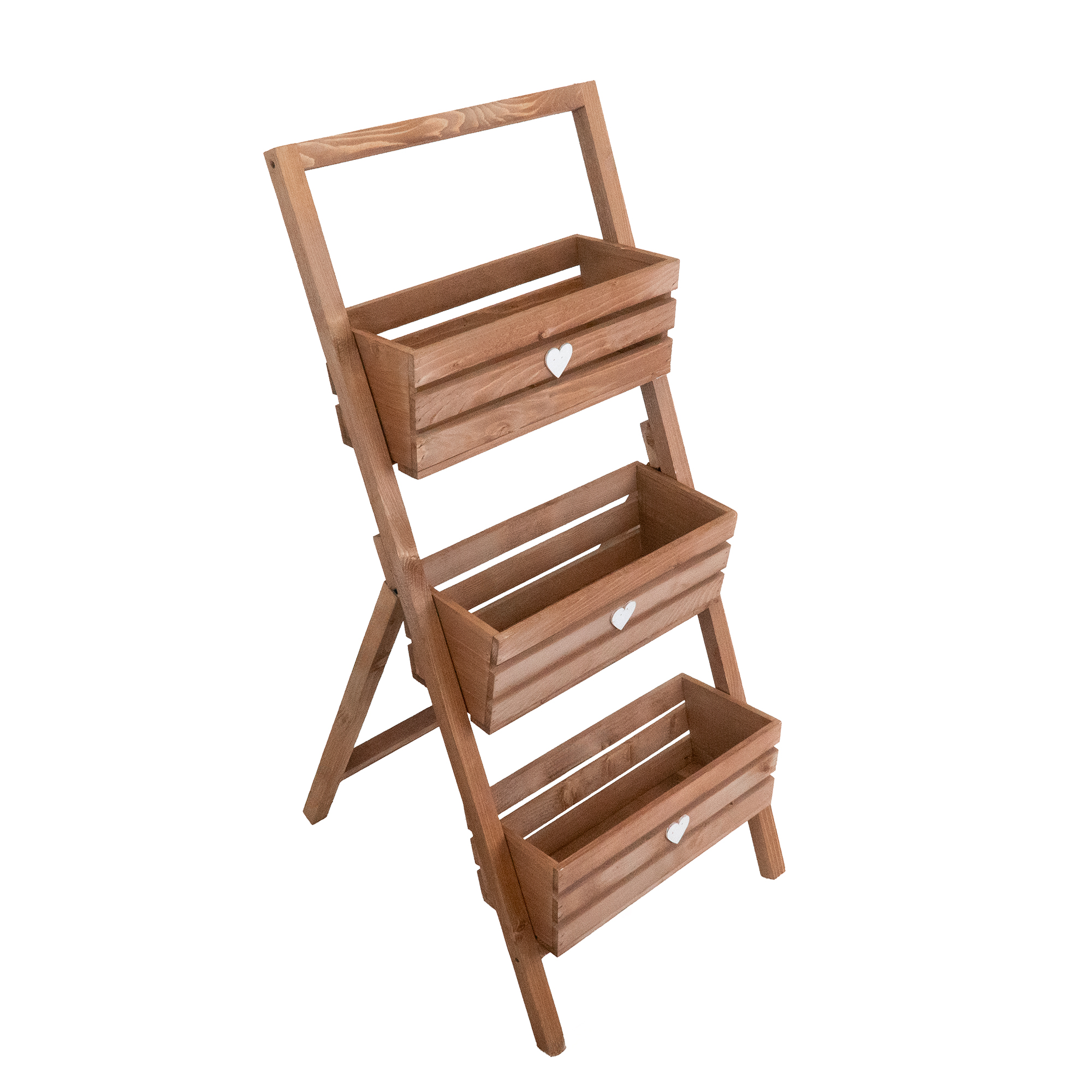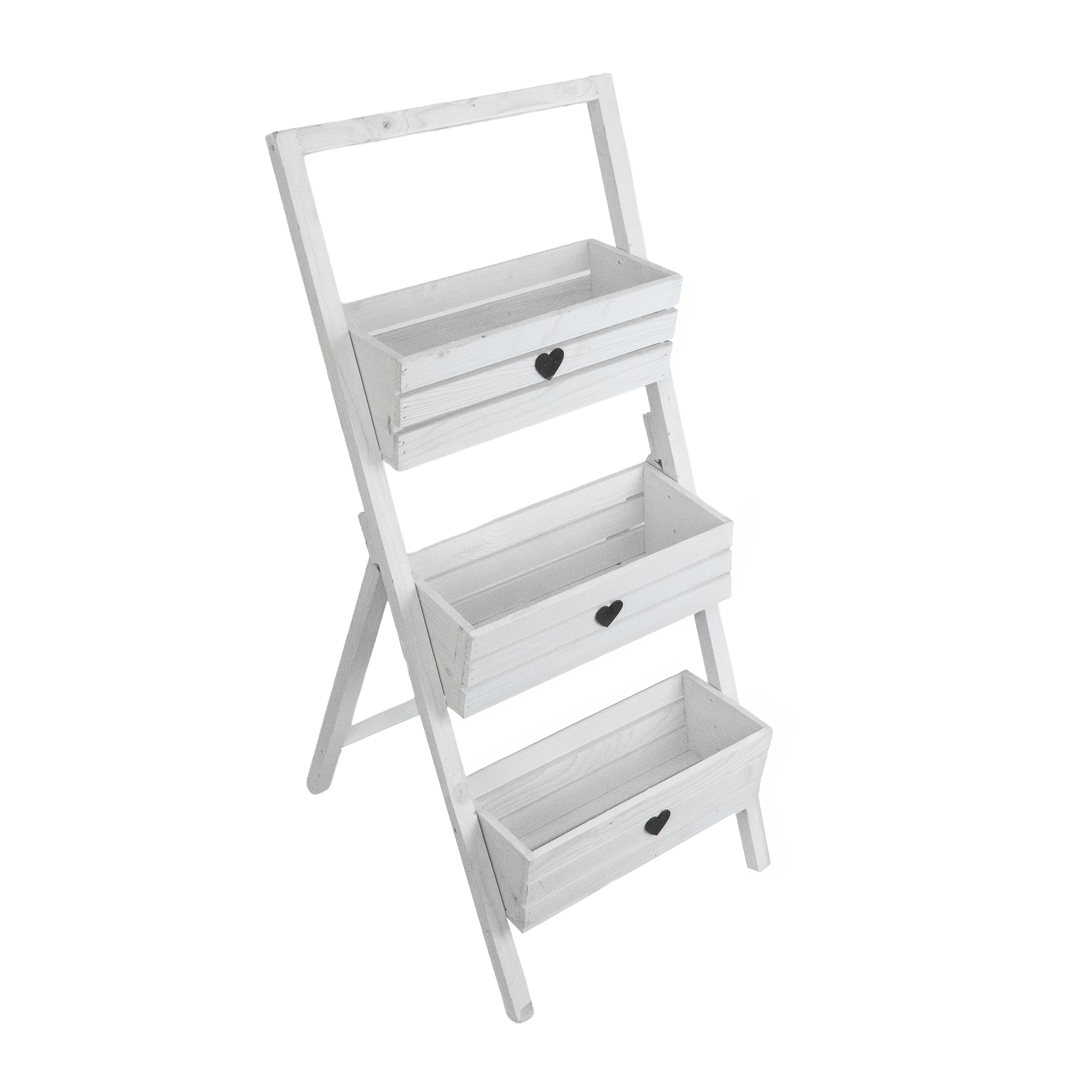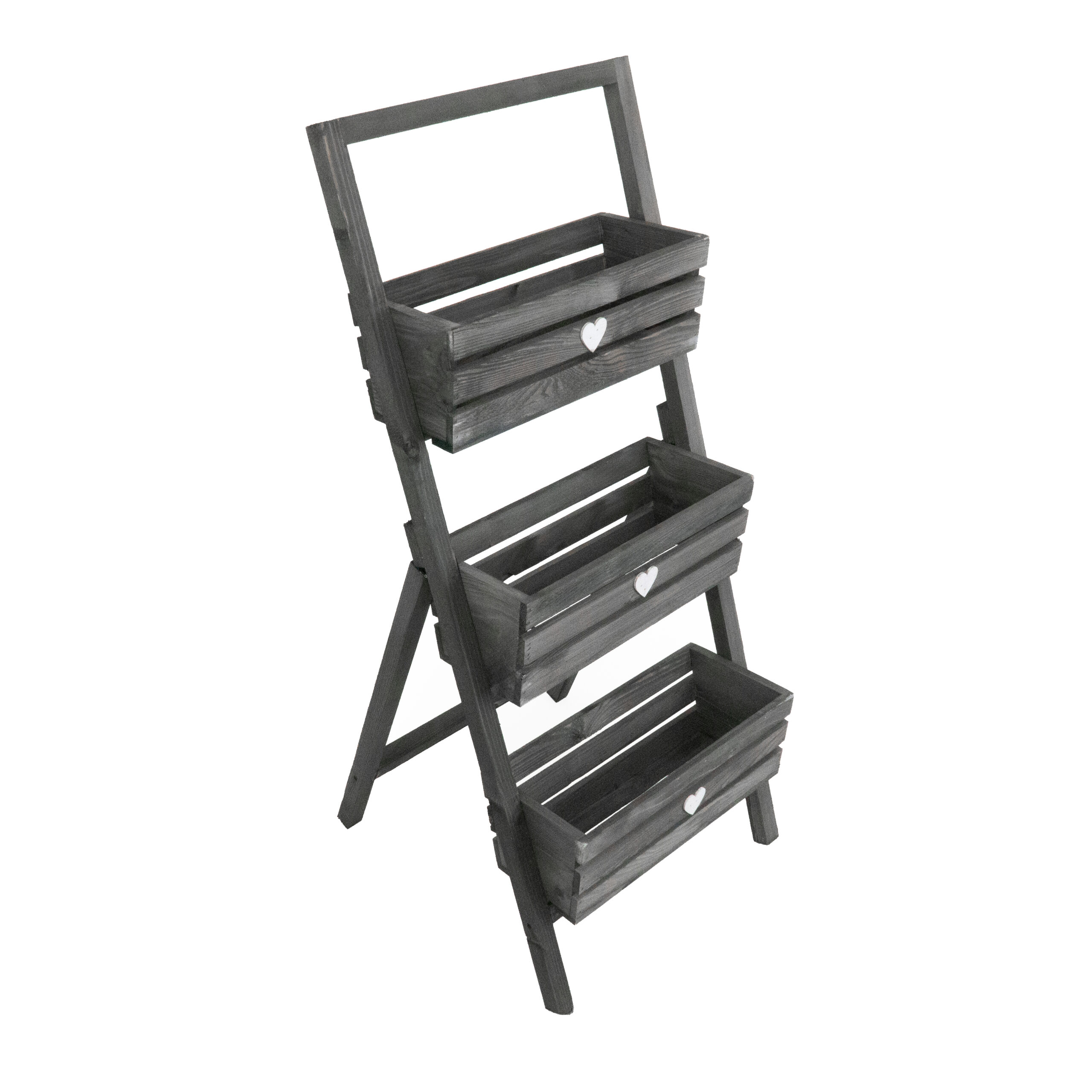 Stylowy i funkcjonalny kwietnik w formie drabinki to idealne rozwiązanie do ekspozycji roślin w domu, na balkonie czy tarasie. Wykonany z drewna, wyposażony w trzy pojemne skrzynki z ozdobnymi serduszkami. Stabilna konstrukcja pozwala na wygodne ustawienie w dowolnym miejscu. Dostępny w czterech wersjach kolorystycznych, by dopasować się do każdego wnętrza i stylu.