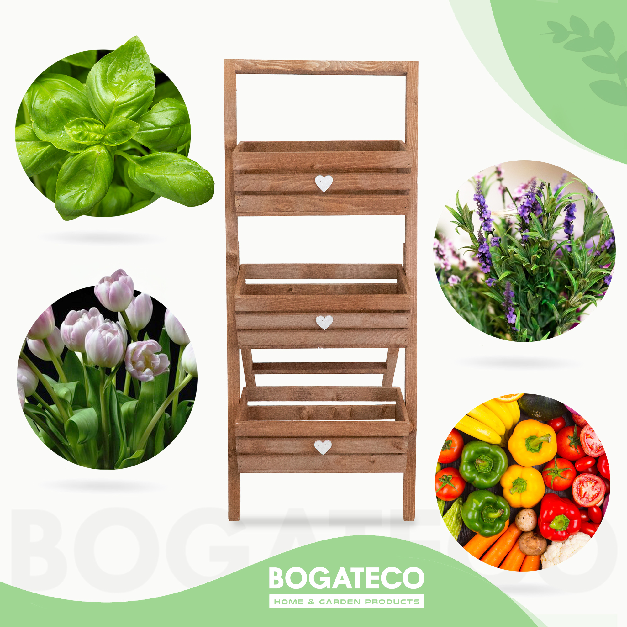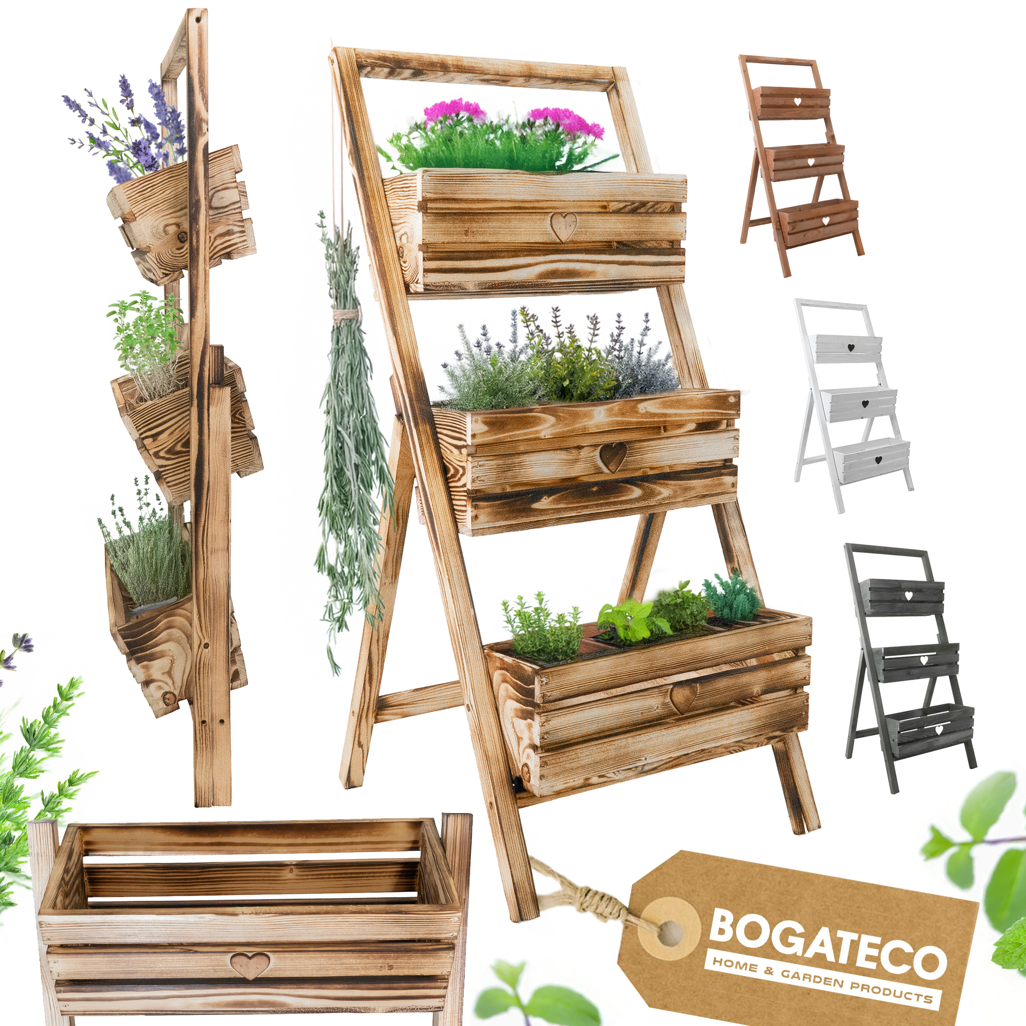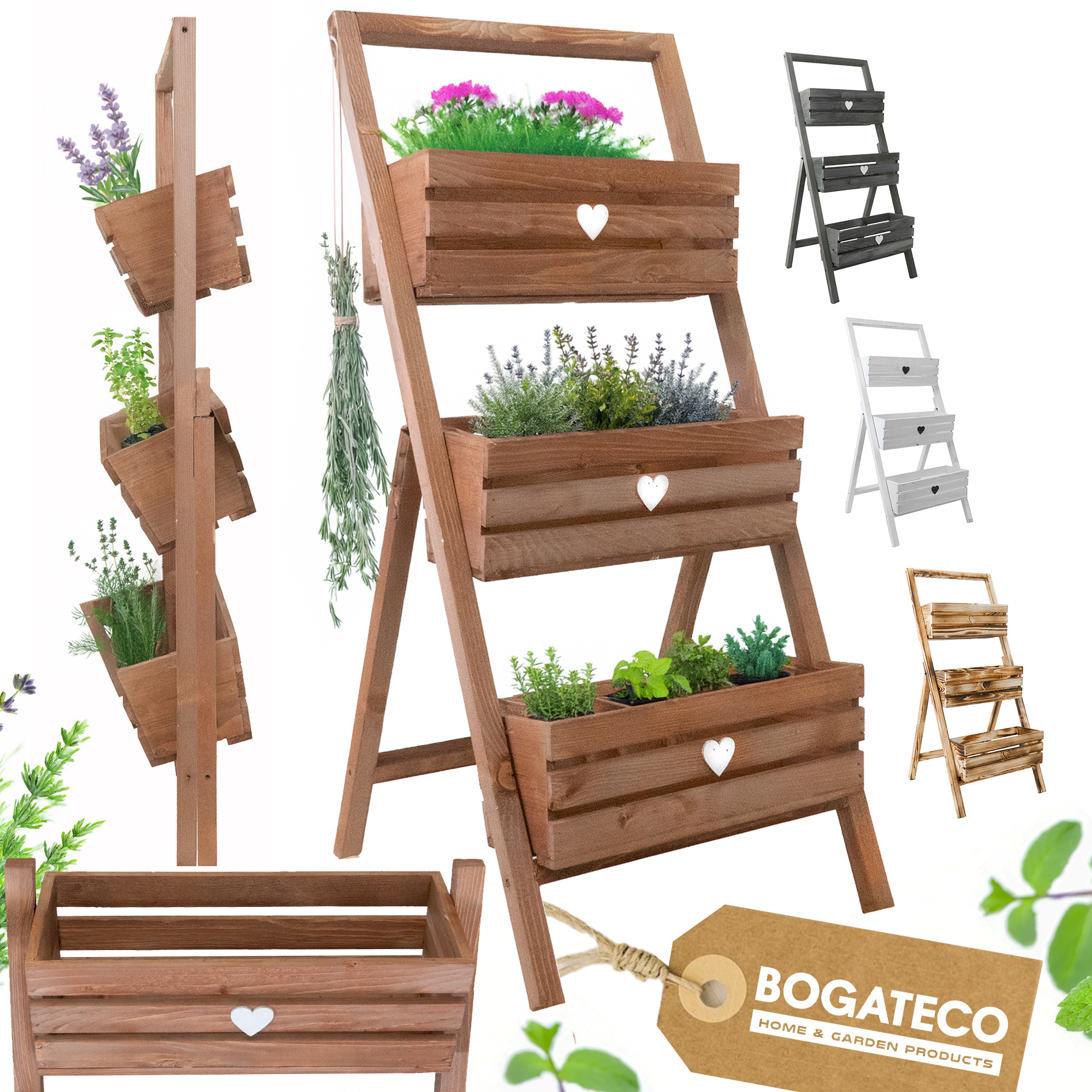 Wprowadź harmonię natury do swojego wnętrza, balkonu lub ogrodu dzięki eleganckiemu, trzypoziomowemu kwietnikowi drabinkowemu marki BOGATECO. Starannie wykonany z naturalnego drewna sosnowego i wykończony w nowoczesnym stylu – łączy funkcjonalność z estetyką, tworząc idealną przestrzeń na kwiaty, zioła czy małe warzywa.