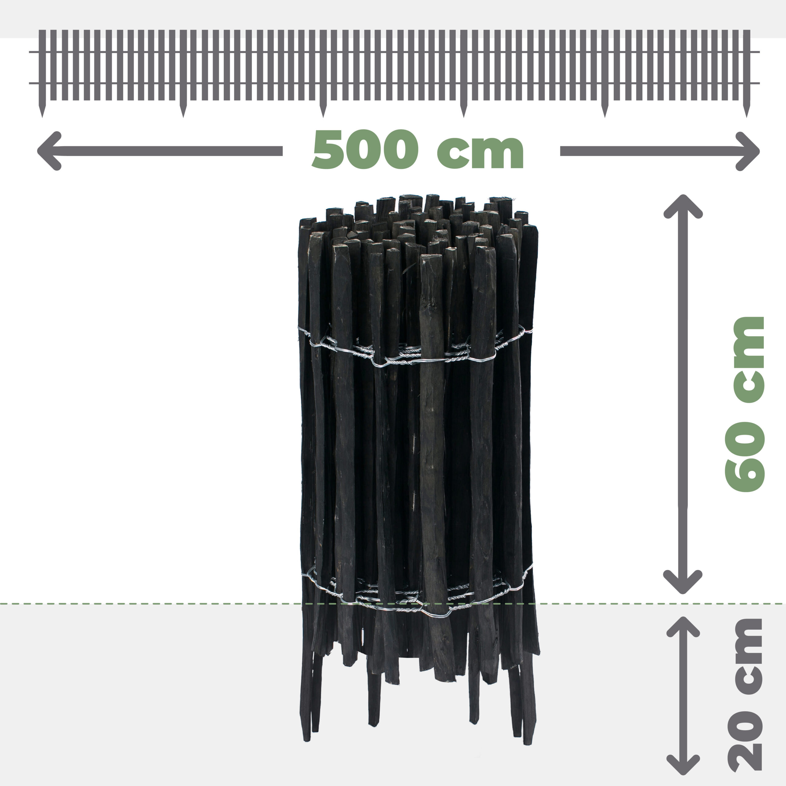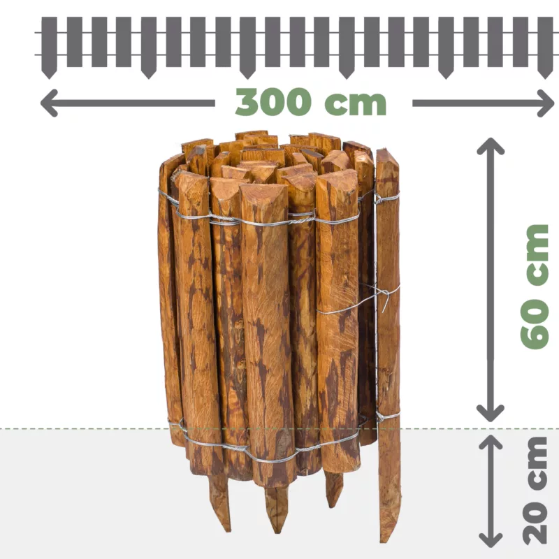 - Montaż: wbij płotek w ziemię. Kilka sztachetek ma zwiększoną długość o 20 cm i zaostrzone końce dla łatwego montażu.
