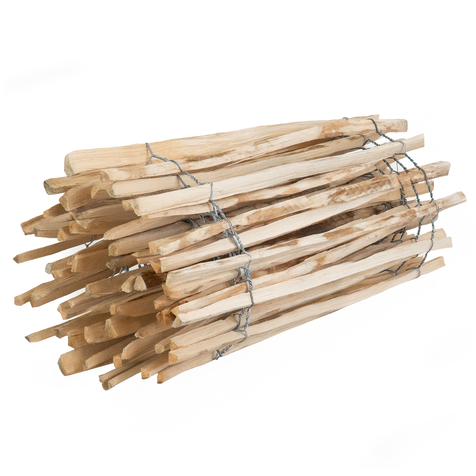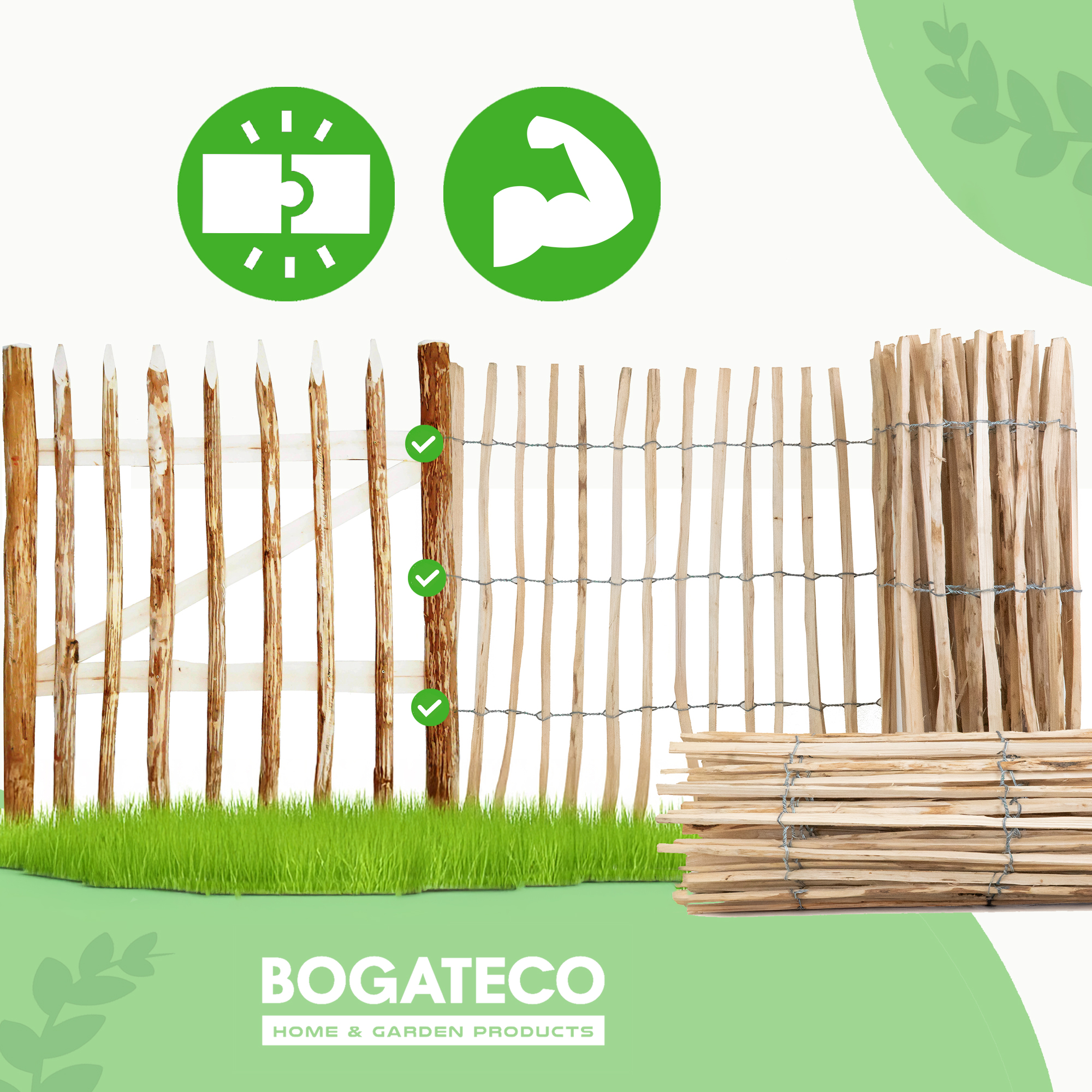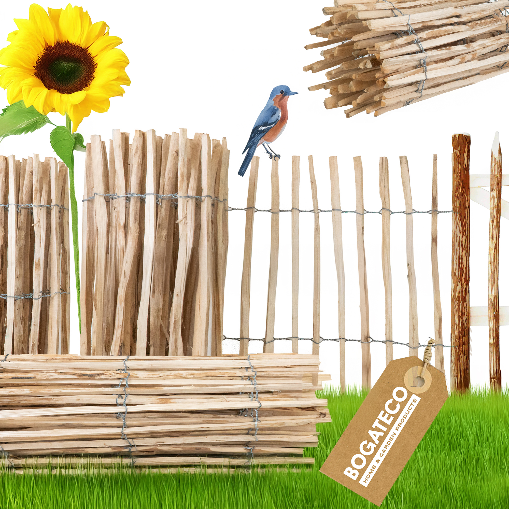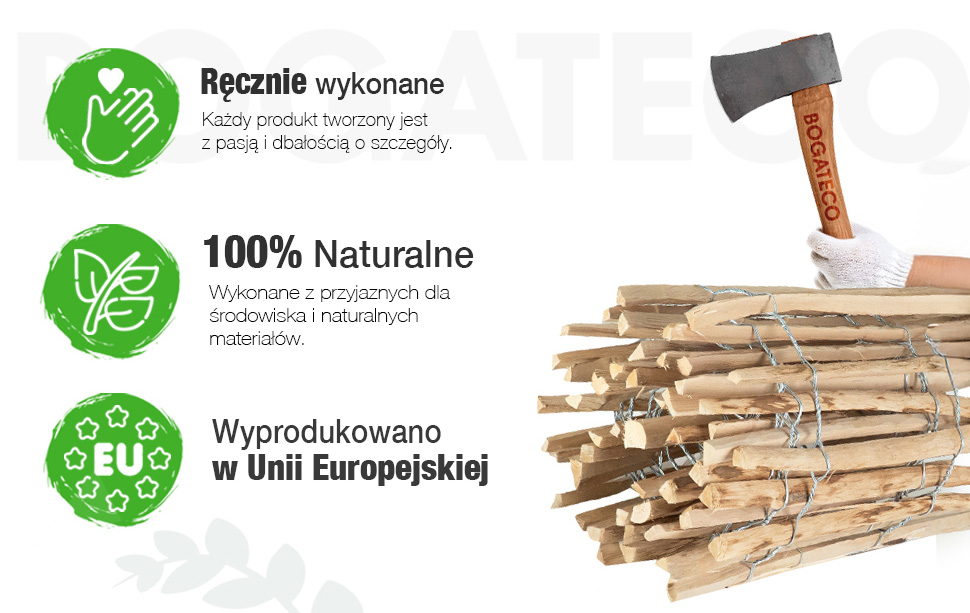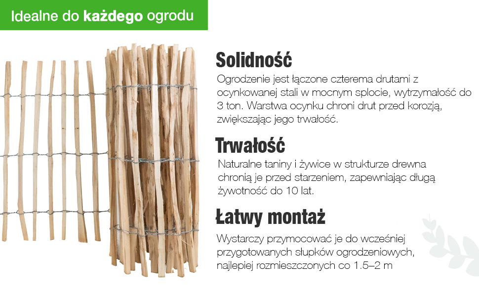 - Sztachetki: łupane, połączone ocynkowanym drutem stalowym o grubości 1,8–2,0 mm, co zapewnia trwałość i stabilność konstrukcji.