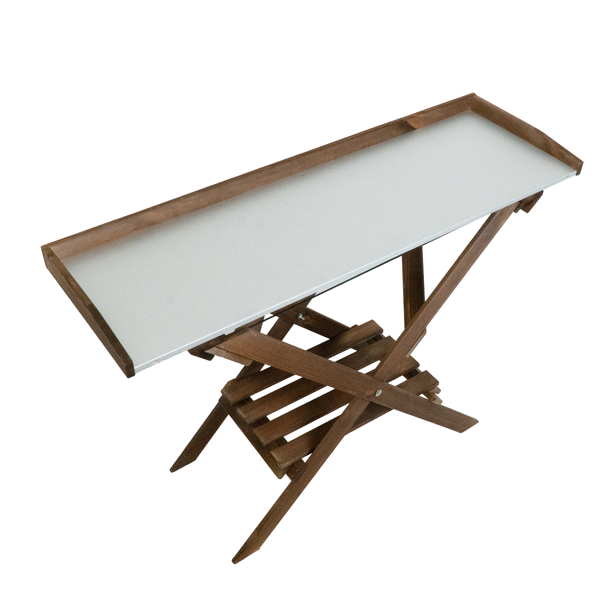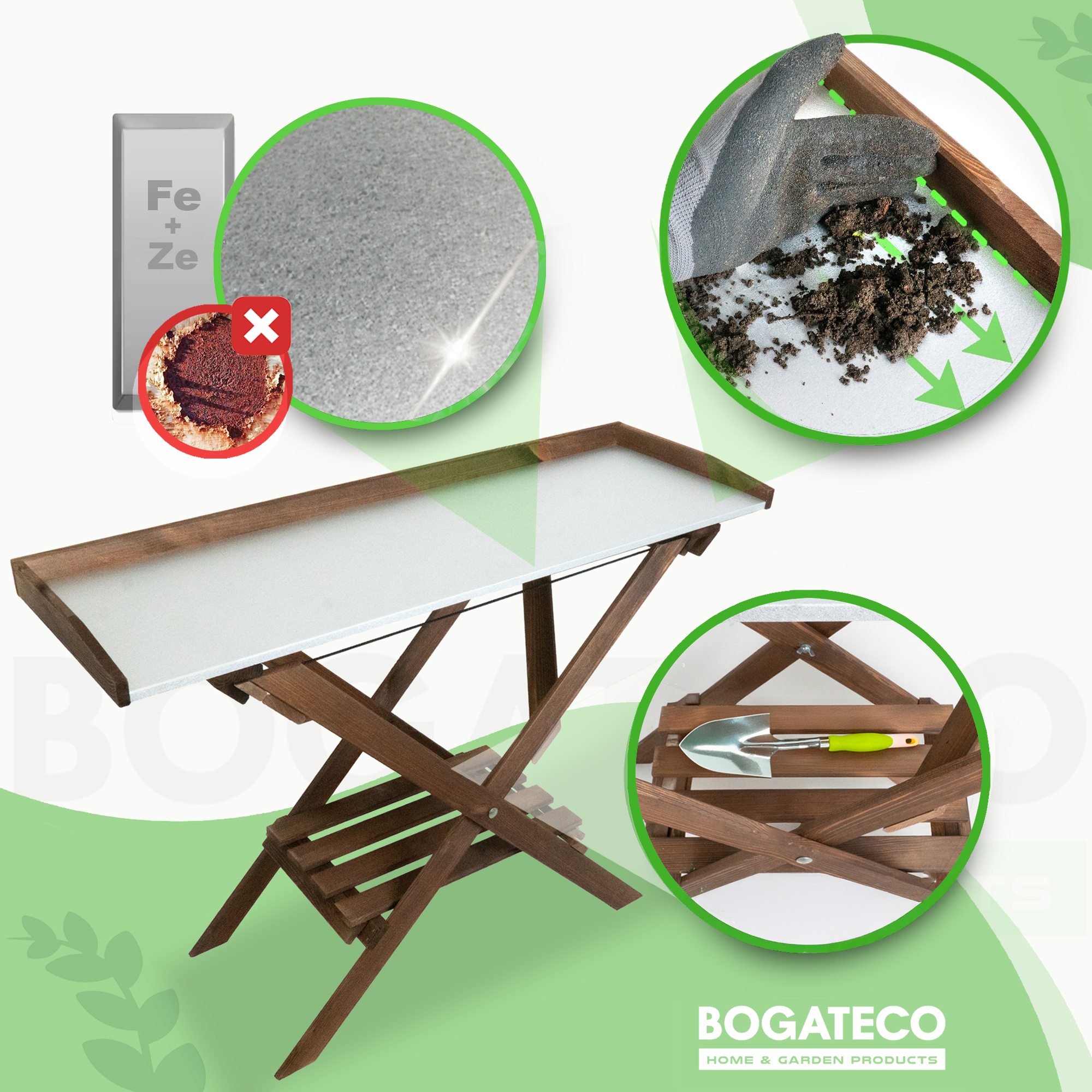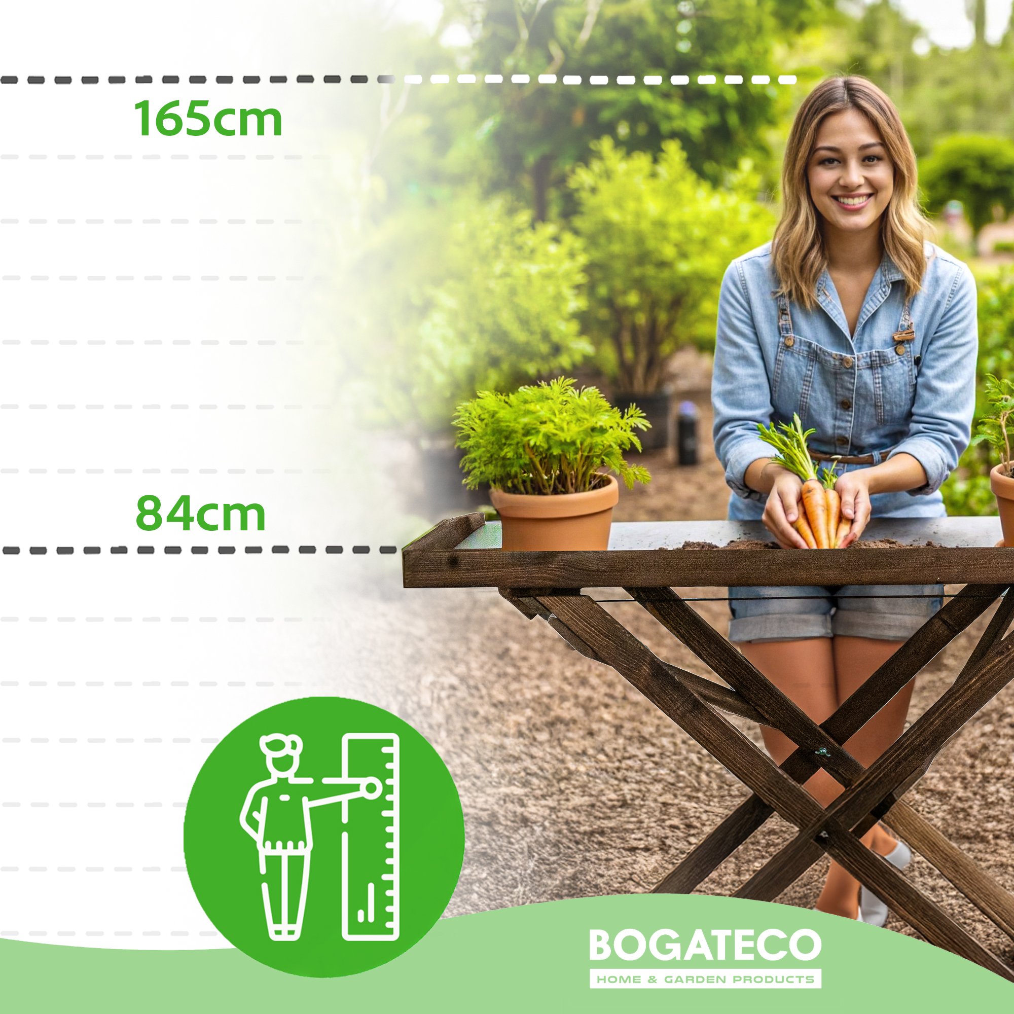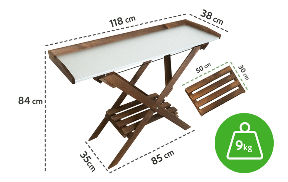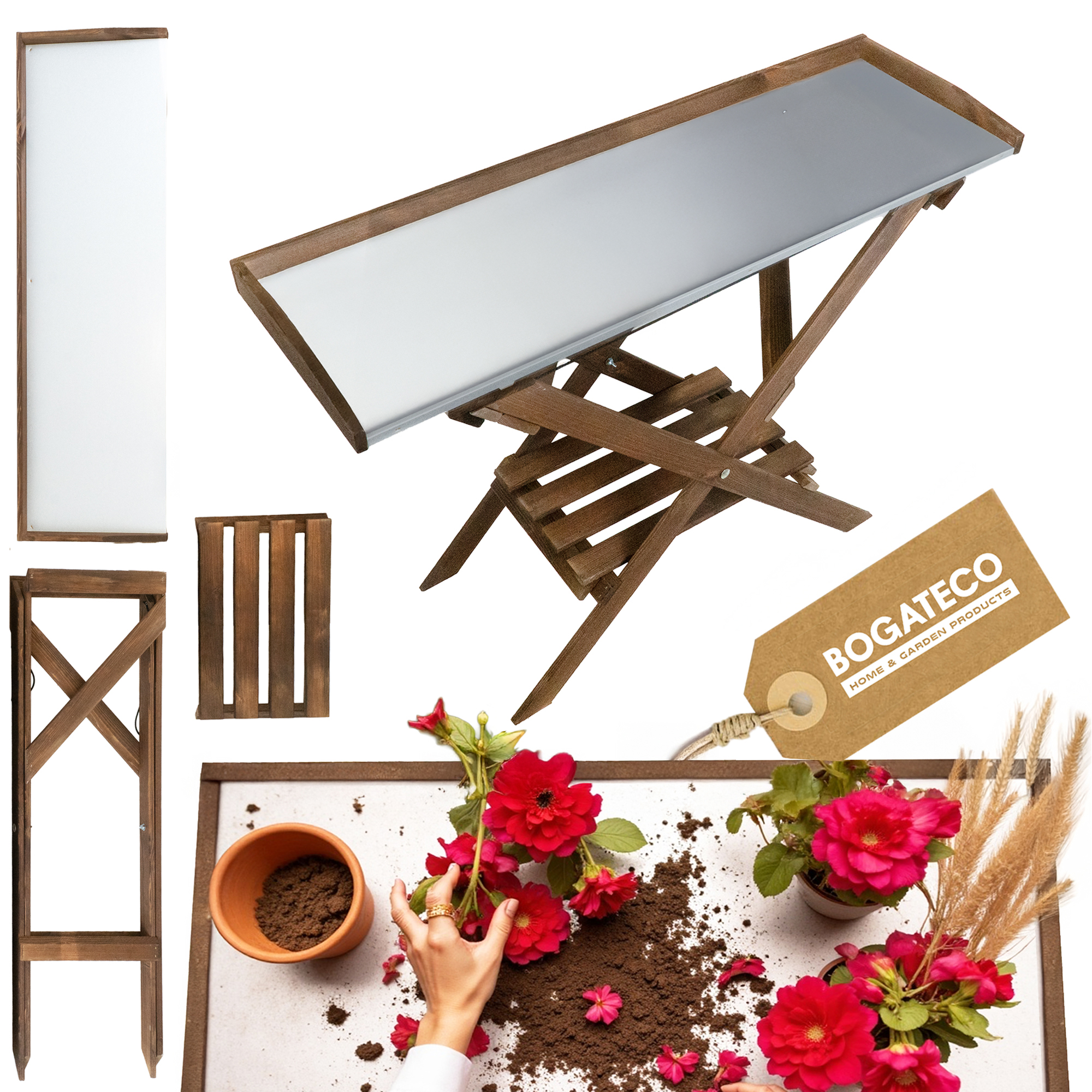 FUNKCJONALNOŚĆ – Duży blat roboczy (118 × 38 cm) z podniesionymi krawędziami zapobiega rozsypywaniu się ziemi i narzędzi. Dodatkowa półka dolna (50 × 30 cm) umożliwia przechowywanie doniczek, narzędzi i innych akcesoriów ogrodniczych. Konstrukcja jest składana, co ułatwia jej przechowywanie po sezonie.