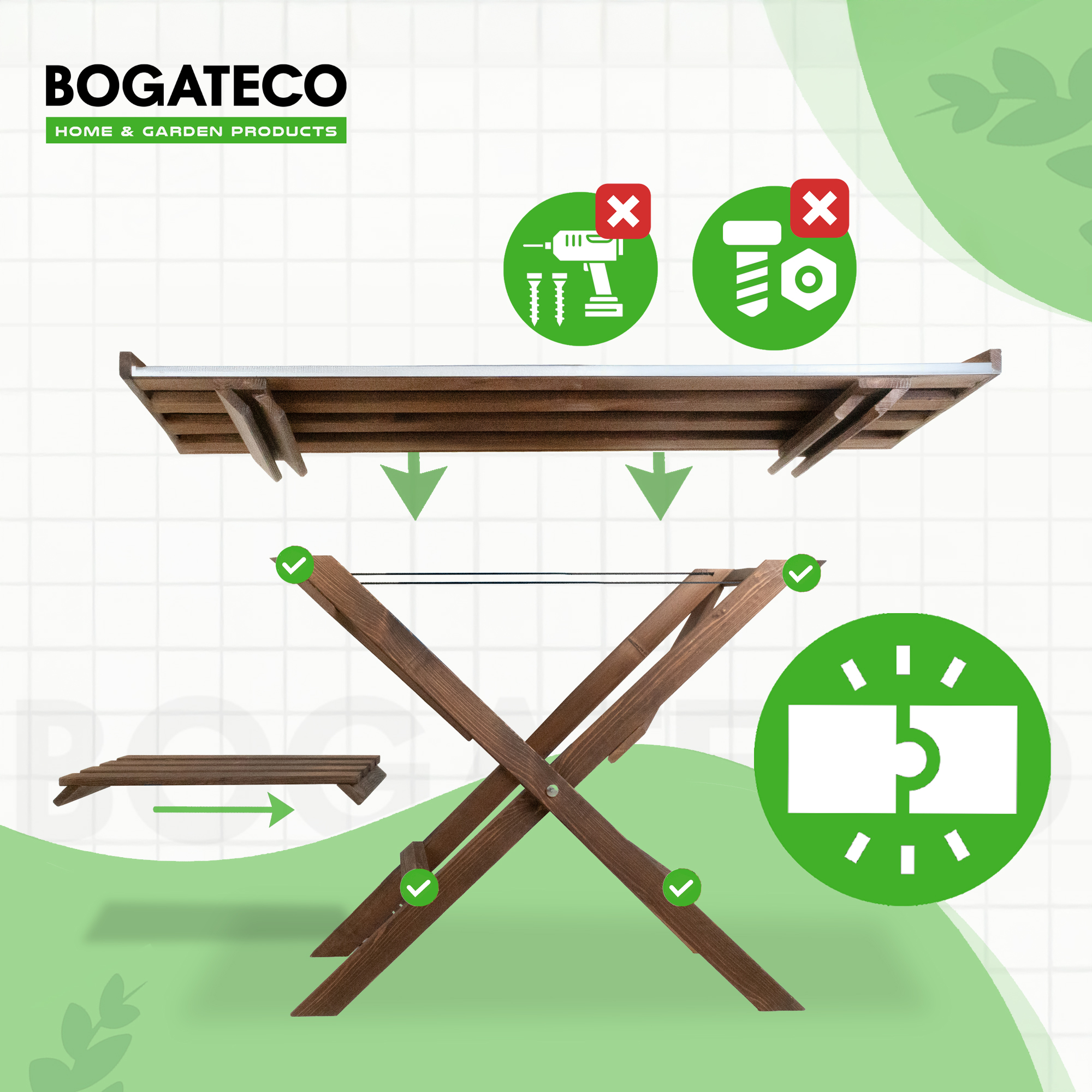 Stół ogrodniczy został zaprojektowany i wykonany przez firmę BOGATECO – polskiego producenta specjalizującego się w ekologicznych meblach i akcesoriach do domu i ogrodu. Marka łączy funkcjonalność z dbałością o środowisko naturalne.