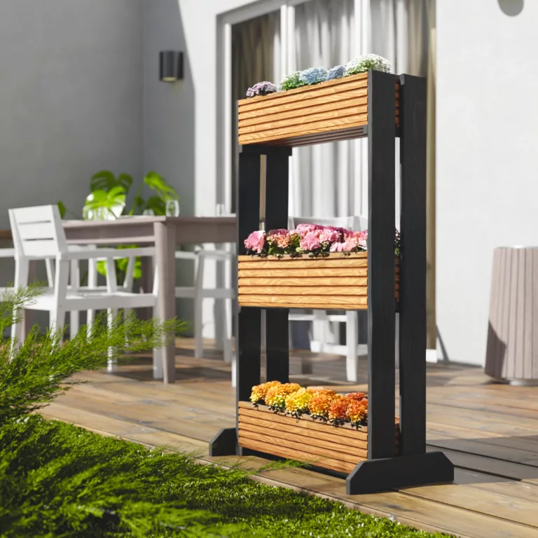 Praktyczny i stylowy trzypoziomowy kwietnik to idealne rozwiązanie dla domu i ogrodu.  Doskonale sprawdzi się zarówno w domu, na balkonie, tarasie, jak i w ogrodzie. Dzięki trzem poziomom umożliwia wygodne sadzenie dekoracyjnych kwiatów, młodych warzyw, aromatycznych ziół. Konstrukcja została pomalowana w pięciu modnych kolorach i dokładnie zaimpregnowana, co zapewnia trwałość na warunki atmosferyczne.