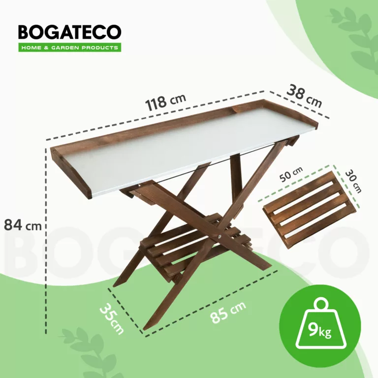 FUNKCJONALNOŚĆ – Duży blat roboczy (118 × 38 cm) z podniesionymi krawędziami zapobiega rozsypywaniu się ziemi i narzędzi. Dodatkowa półka dolna (50 × 30 cm) umożliwia przechowywanie doniczek, narzędzi i innych akcesoriów ogrodniczych. Konstrukcja jest składana, co ułatwia jej przechowywanie po sezonie.